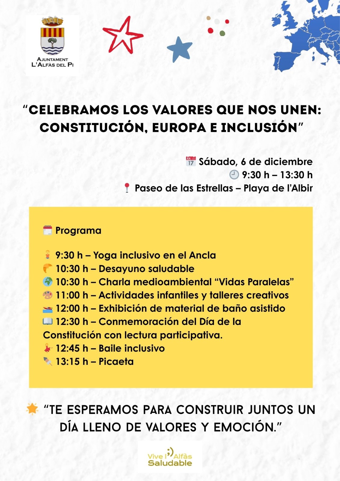 El Ayuntamiento de l’Alfàs del Pi celebrará mañana sábado 6 de diciembre el Día de la Constitución con la jornada ‘Celebramos los valores que nos unen: Constitución, Europa e Inclusión’, una propuesta abierta a toda la ciudadanía que se desarrollará de 09:30 a 13:30 horas en el Paseo de las Estrellas de la Playa del Albir, recientemente remodelado con Fondos Europeos NextGeneration.