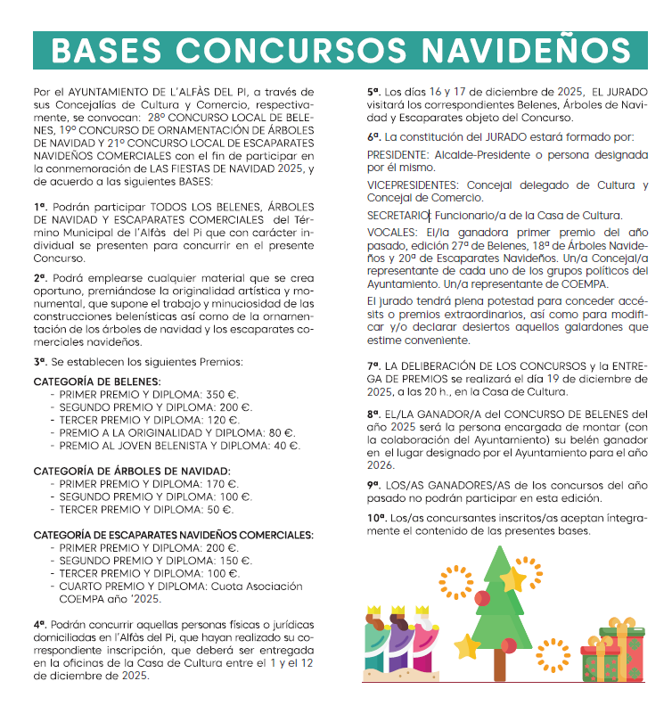 En cuanto al concurso de ornamentación de árboles de navidad, se concederán tres premios de 170, 100 y 50 euros. Por último, en el Concurso de Escaparates Navideños Comerciales se entregarán tres premios, de 200, 150 y 100 euros. El cuarto clasificado obtendrá la cuota de 2025 de la Asociación de Comerciantes y Empresarios de l’Alfàs (COEMPA). Se trata de animar a los empresarios para que decoren sus establecimientos y, de este modo, crear un ambiente agradable de compra en el municipio durante la campaña navideña. Una iniciativa que persigue, en definitiva, fomentar las ventas en el comercio local.