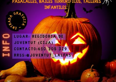 Desde el Ayuntamiento de l’Alfàs se invita a todas las niñas y niños del municipio a que se acerquen y participen en esta fiesta, una tarde terrorífica, donde las calabazas, brujas y fantasmas se apoderarán de todos los rincones. Es recomendable ponerse atuendos de miedo, para asustar mejor y más rápido a amigos y amigas.