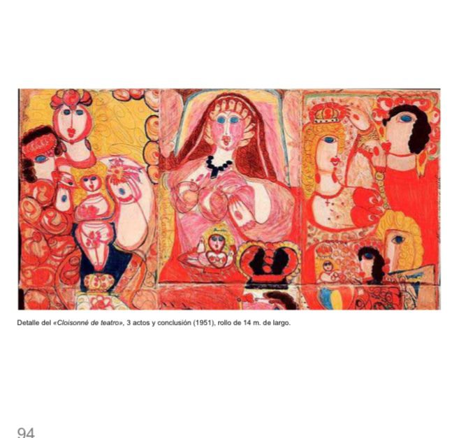 En el texto, Durán describe cómo Aloise construyó un imaginario poblado por reinas, heroínas, amantes y personajes históricos que se entrelazan en composiciones monumentales. Entre ellas destaca Cloisonné del teatro, una obra de 14 metros de largo donde la artista despliega una auténtica autobiografía escénica, cosida literalmente a base de hojas de papel kraft.