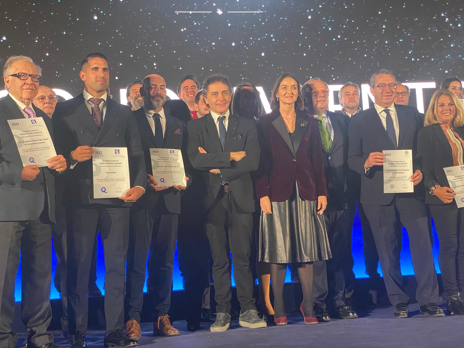 Los Premios Q 2023 premian el esfuerzo realizado por apostar por la calidad, seguridad y sostenibilidad certificada y se conceden por el Instituto para la Calidad Turística Española, en una gala celebrada en la Galería de Cristal del Palacio de Cibeles, durante la Noche Q, en un acto que coincide con Fitur, presidido por la ministra de Turismo Reyes Maroto y el presidente del ICTE, Miguel Mirones, y a la que ha asistido el concejal de Turismo de l’Alfàs, Luis Morant.