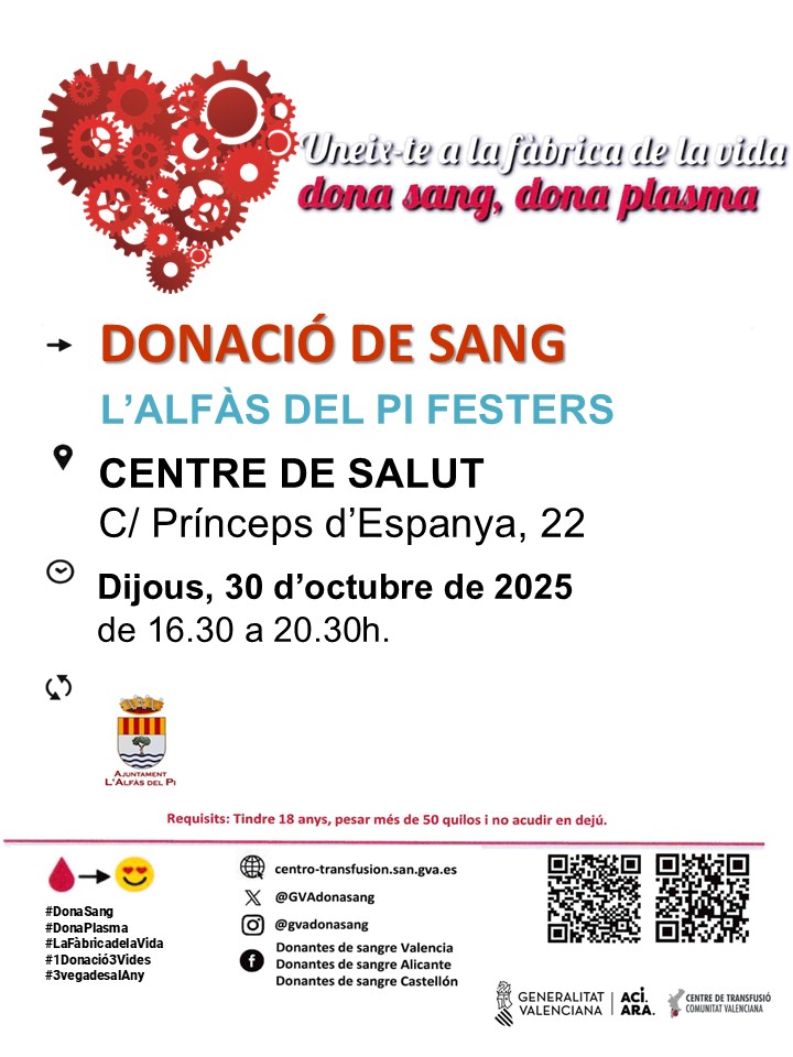 Mañana jueves 30 de octubre se celebra una campaña de captación de donantes de sangre en el Centro de Salud de l’Alfàs, y la concejalía de Sanidad invita al mundo festero a sumarse a esta red solidaria donando sangre y plasma. Mañana jueves a partir de las 16.30 horas y hasta las 20.30 horas.