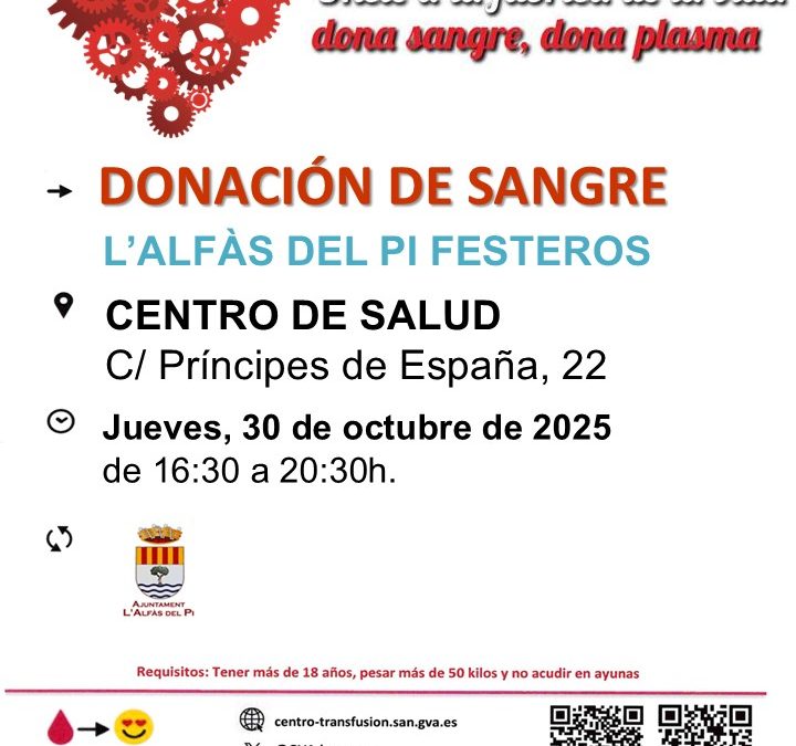 Mañana jueves 30 de octubre se celebra una campaña de captación de donantes de sangre en el Centro de Salud de l’Alfàs, y la concejalía de Sanidad invita al mundo festero a sumarse a esta red solidaria donando sangre y plasma. Mañana jueves a partir de las 16.30 horas y hasta las 20.30 horas.