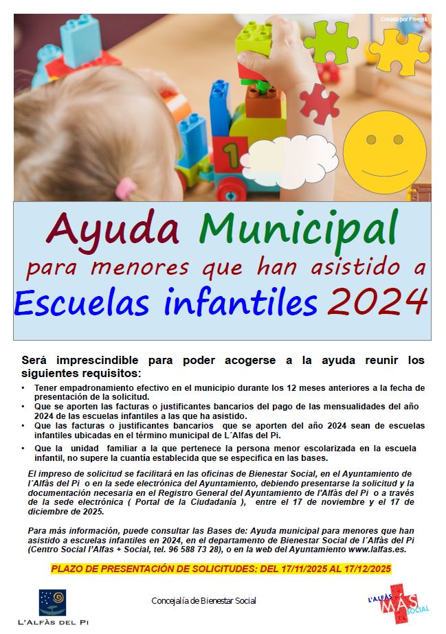 El Ayuntamiento de l’Alfàs del Pi ha abierto el plazo de solicitud de la ayuda municipal destinada a las familias con menores que han asistido a las guarderías, Escuelas Infantiles, de l’Alfàs del Pi durante el año 2024. Las personas interesadas podrán presentar la instancia en el Registro General del Ayuntamiento, en horario de atención al público, o bien a través del registro electrónico de entrada (requiere certificado digital), disponible en: https://ciudadano.lalfas.es/PortalCiudadania.