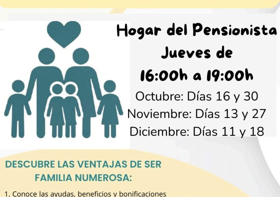 Mañana jueves 11 de diciembre de 16:00 horas a 19:00 horas, en la Sala Multiusos del Hogar del Pensionista, Bienestar Social habilita un punto de información para las familias numerosas.