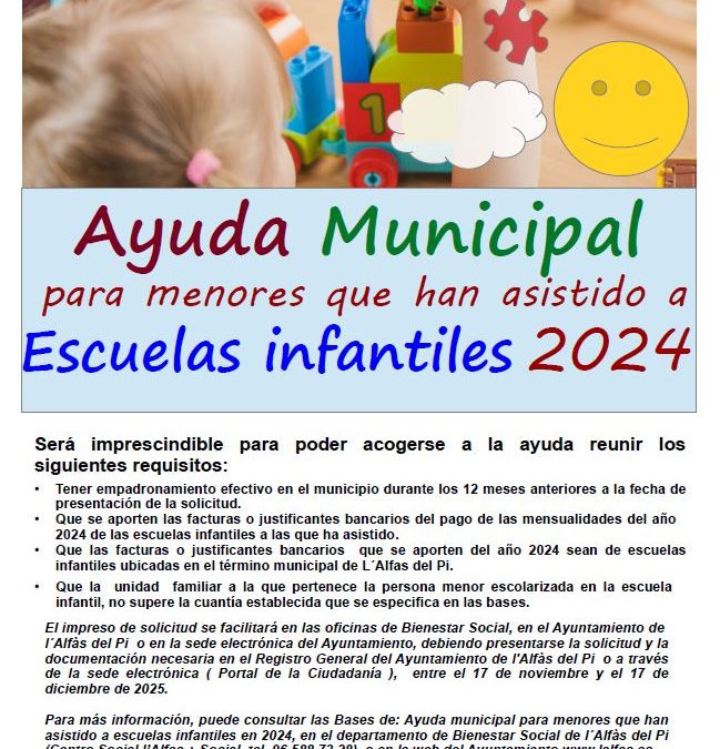 A partir del próximo lunes, 17 de noviembre, se abrirá el plazo de solicitud de la ayuda municipal destinada a las familias con menores que han asistido a las Escuelas Infantiles de l’Alfàs del Pi durante el año 2024. Las personas interesadas podrán presentar la instancia en el Registro General del Ayuntamiento, en horario de atención al público, o bien a través del registro electrónico de entrada (requiere certificado digital), disponible en: https://ciudadano.lalfas.es/PortalCiudadania. “Con estas ayudas reafirmamos nuestra apuesta por la educación y el bienestar infantil, garantizando que todos los niños y niñas menores de 3 años de l’Alfàs puedan acceder a una atención educativa de calidad”, ha destacado la concejala Marisa Cortés. Deberá adjuntarse toda la documentación requerida junto a la solicitud.