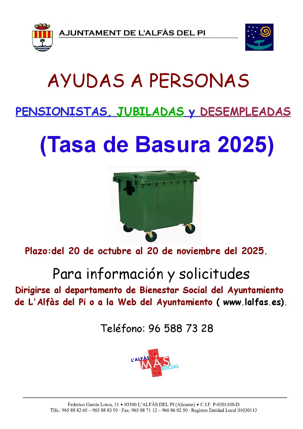 A partir del próximo lunes, 20 de octubre, la concejalía de Bienestar Social del Ayuntamiento de l’Alfàs del Pi abrirá el plazo para solicitar las ayudas municipales directas destinadas a sufragar el pago de la tasa de basura. Una convocatoria dirigida a personas pensionistas, jubiladas y desempleadas empadronadas en el municipio.
