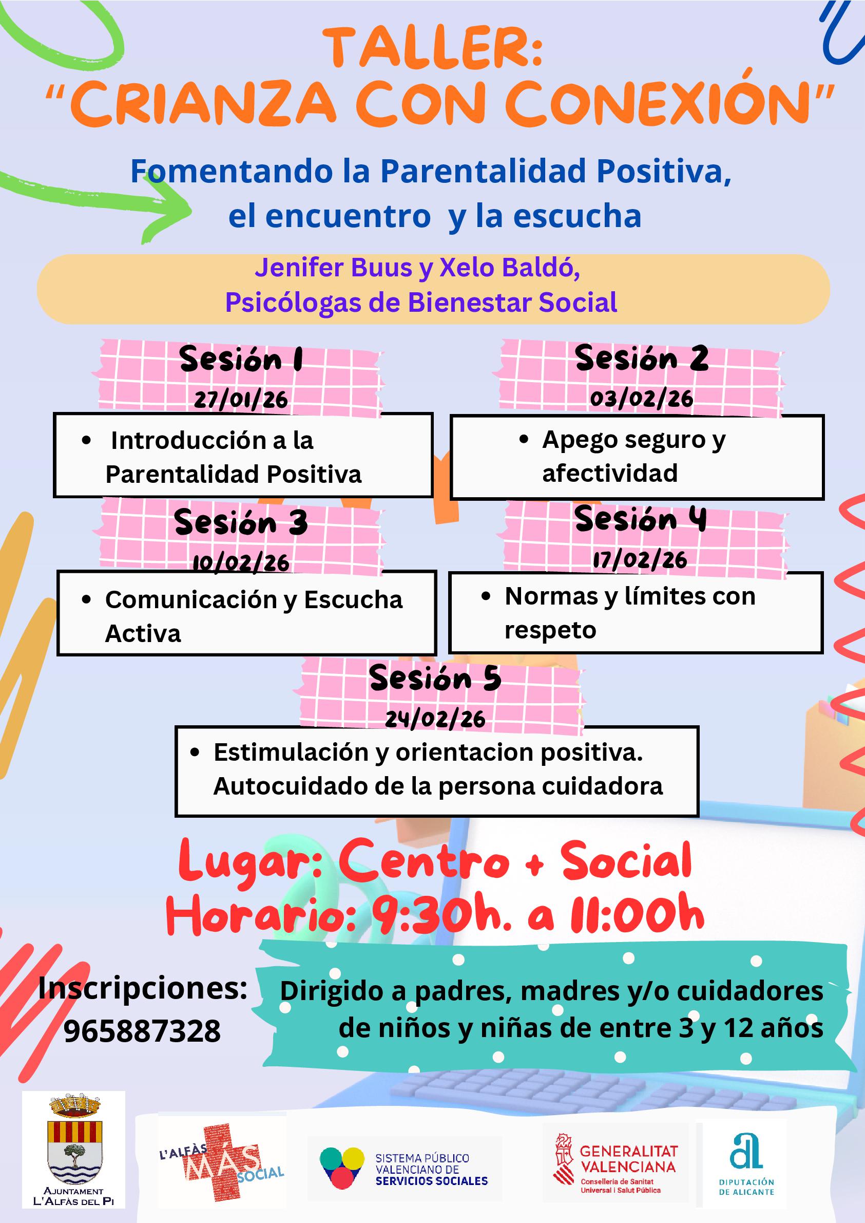 El Ayuntamiento de l’Alfàs del Pi ha organizado el taller gratuito ‘Crianza con conexión: fomentando la Parentalidad Positiva, el encuentro y la escucha’, una iniciativa de la concejalía de Bienestar Social que dará comienzo el martes 27 de enero y que está dirigida a madres, padres y personas cuidadoras de niñas y niños de entre 3 y 12 años.