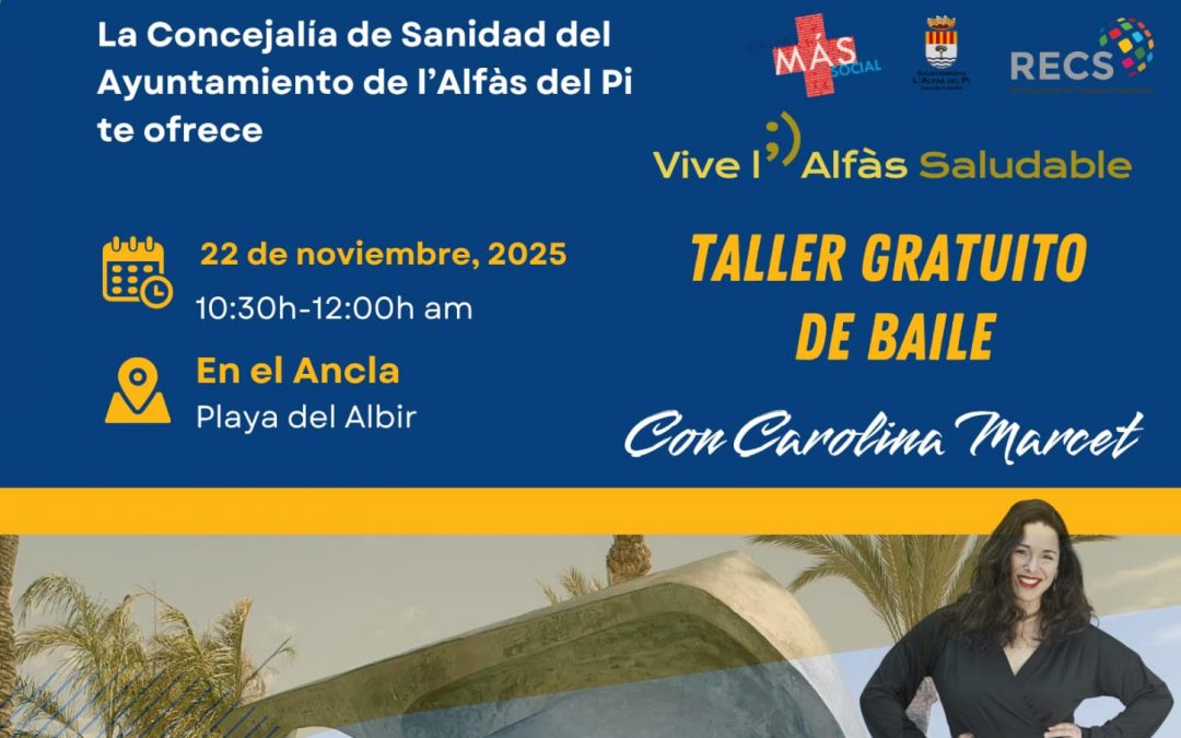El penúltimo sábado de cada mes las concejalías de Bienestar y Sanidad del Ayuntamiento de l’Alfàs del Pi organizan. en colaboración con el Club Costa Blanca Balla. los talleres gratuitos de Baile Saludable al aire libre, dirigidos a todos los públicos, en la playa de l’Albir, en el Paseo de las estrellas a la altura de la escultura del Ancla, de Jorge Castro.