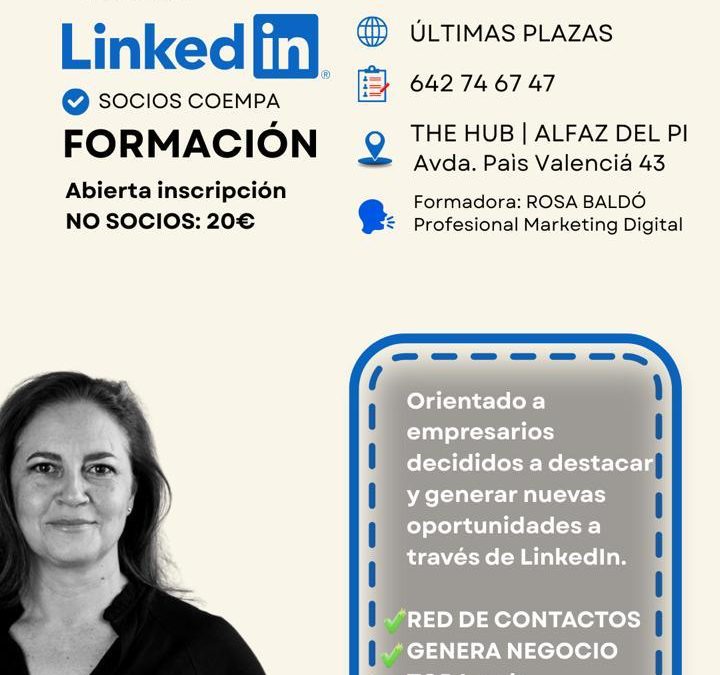 COEMPA, la Asociación del Comercio y Empresas de l’Alfàs, ha organizado un curso exprés para esta tarde sobre Linkedin y marketing digital, desde las 19:00 horas hasta las 21:00 horas en The HUB Business Centre, en avenida País Valenciano 43b. Inscripciones para asistir a través del 642.74.67.47