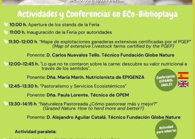 La jornada técnica, que contará con la participación del Observatorio del Pastoralismo Mediterráneo (OPEM), abordará temas clave del sector desde un enfoque divulgativo y formativo. Entre los ponentes destacan Carlos Nuevalos Tello, técnico de la Fundación Globe Nature, quien presentará el “Mapa de explotaciones ganaderas extensivas certificadas por el PGEP”; la nutricionista María Marín, de EPIGENZA, con la charla “Lo que no te contaron sobre la carne: descubre su valor nutricional a través de los sentidos”; Paula Lorente, técnica del OPEM, que hablará sobre “Pastoralismo y Servicios Ecosistémicos”; y Alejandro Aguilar Catalá, también de Globe Nature, que cerrará el bloque con “Naturaleza pastoreada: ¿Cómo pastorear más y mejor?”.
