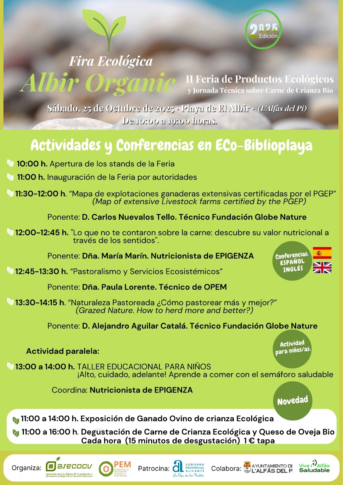 Durante toda la jornada, Albir Organic ofrecerá una completa programación que incluirá stands de productos ecológicos certificados, degustaciones gastronómicas, talleres infantiles, una exposición de ganado ovino ecológico y una jornada técnica especializada en ganadería y carne bio, con demostraciones en vivo y catas de carne de crianza ecológica y queso de oveja producido con prácticas sostenibles.