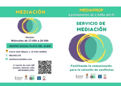 Ofrecer a la ciudadanía asistencia gratuita en mediación como alternativa a la vía judicial es el principal objetivo del servicio Mediaprop, que el Ayuntamiento de l’Alfàs del Pi presta en el Centro Social Platja Albir y que financia la Consellería de Justicia y Administración Pública. Un espacio desde el que se proporciona atención e información sobre la mediación como una vía más rápida, económica y eficaz para resolver conflictos frente a los tradicionales procedimientos judiciales.