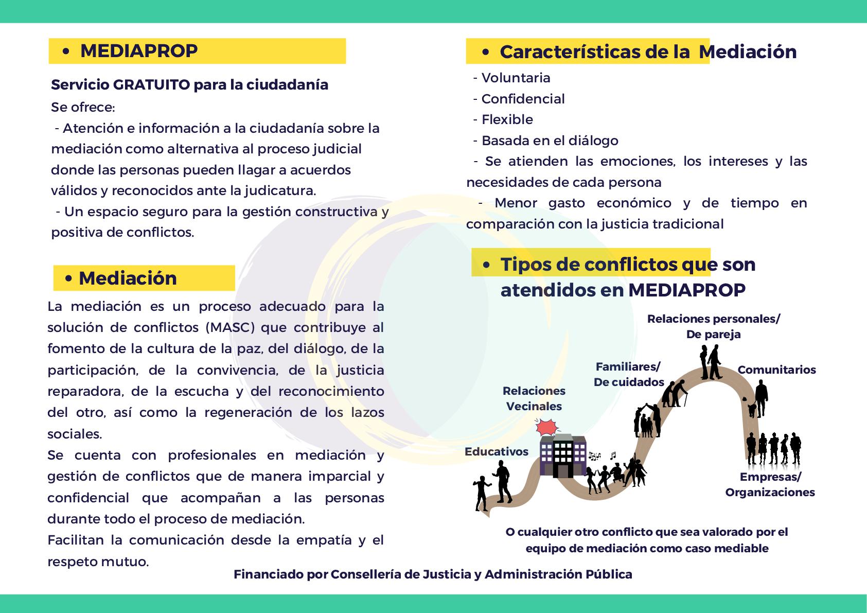 Los conflictos atendidos por el servicio Mediaprop son muy diversos: vecinales, familiares, educativos, de pareja, personales, comunitarios o laborales, entre otros. En todos los casos, el objetivo es promover una convivencia pacífica y fortalecer las relaciones sociales a través del diálogo.