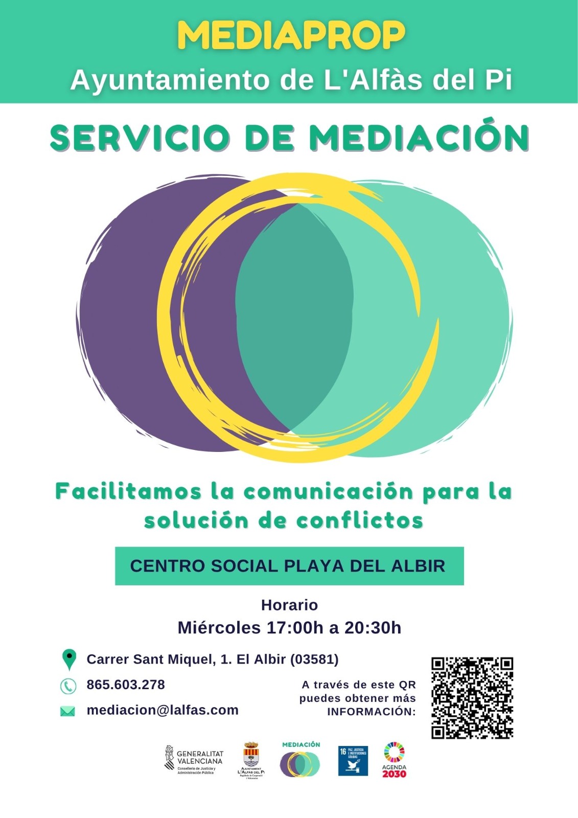 Ofrecer a la ciudadanía asistencia gratuita en mediación como alternativa a la vía judicial es el principal objetivo del servicio Mediaprop, que el Ayuntamiento de l’Alfàs del Pi presta en el Centro Social Platja Albir y que financia la Consellería de Justicia y Administración Pública. Un espacio desde el que se proporciona atención e información sobre la mediación como una vía más rápida, económica y eficaz para resolver conflictos frente a los tradicionales procedimientos judiciales.