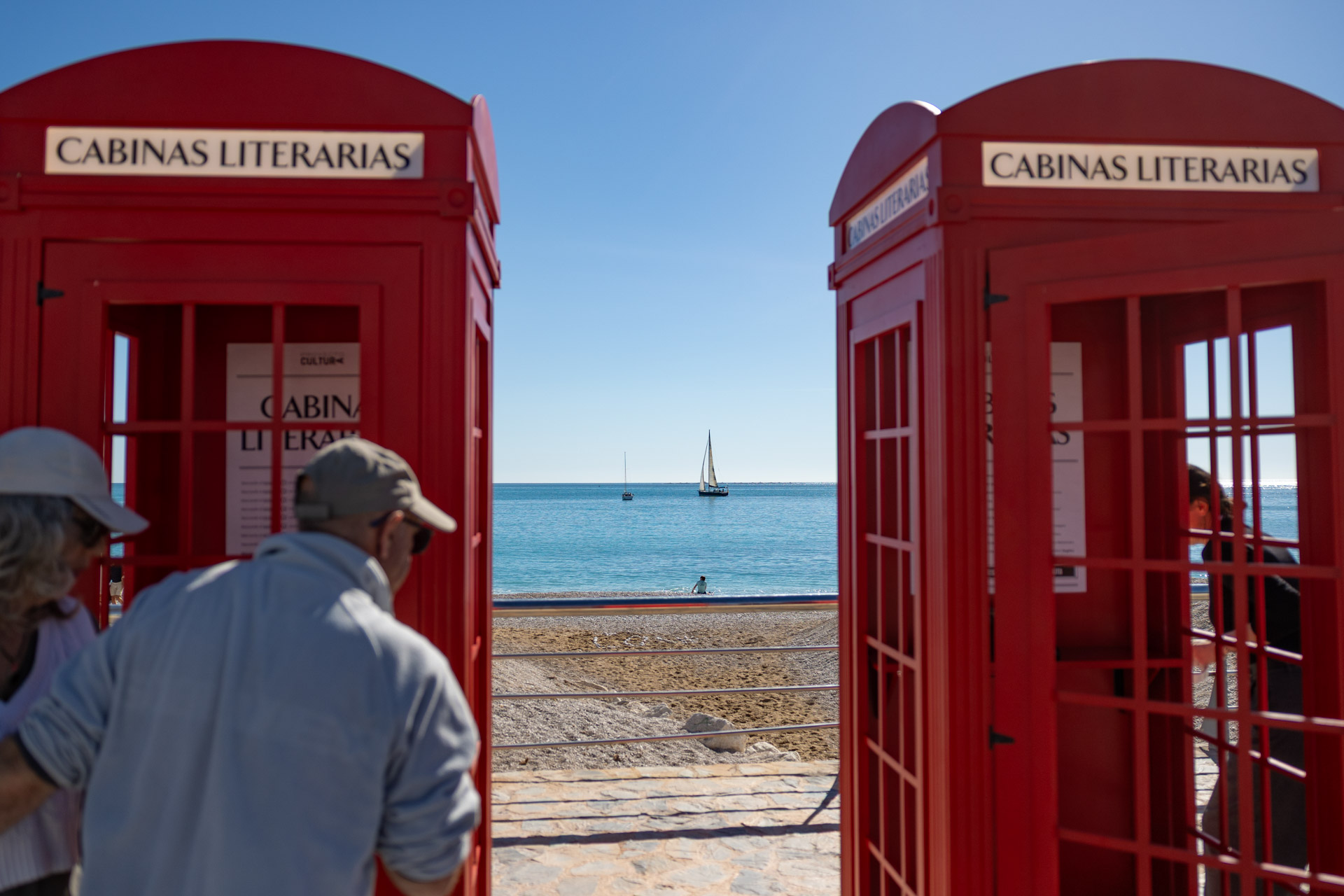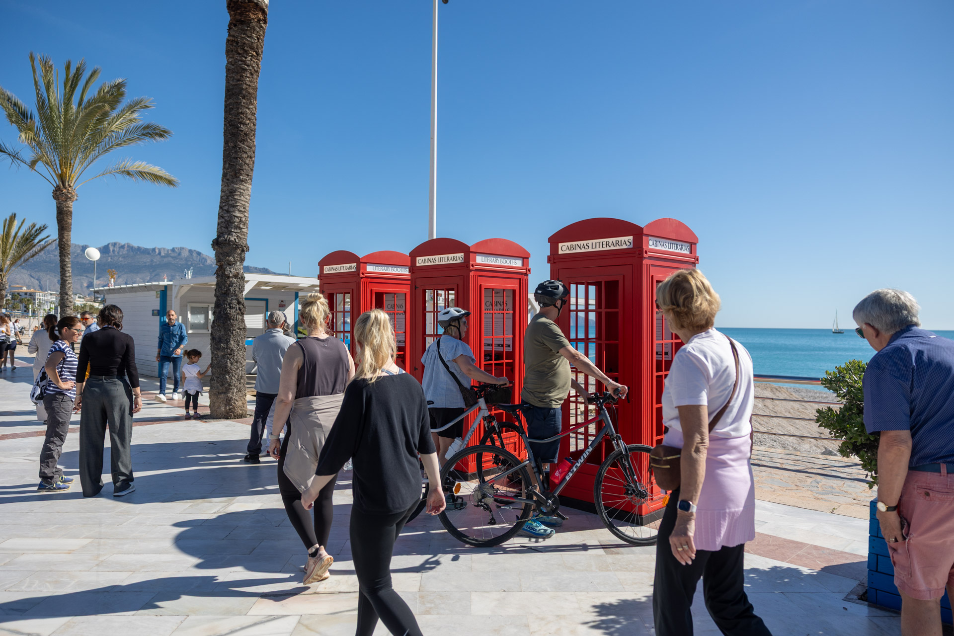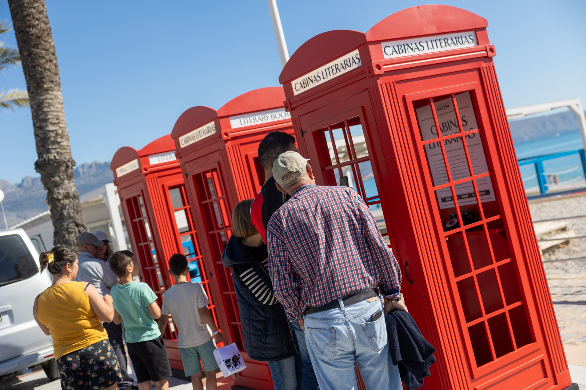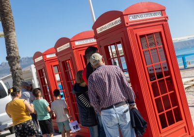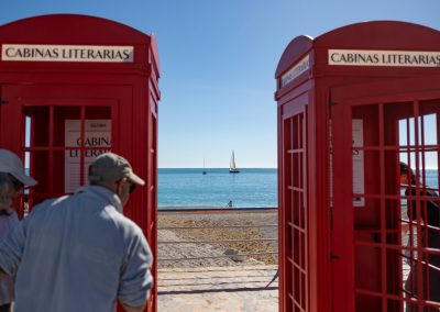 La playa Racó de l’Albir se transformó el domingo de Pascua en un escenario inesperado donde la literatura se escuchó, se sintió… y se vivió. El Paseo de las Estrellas acogió una original instalación artística que invitó a residentes y visitantes a sumergirse en un viaje sensorial único: tres cabinas telefónicas inglesas convertidas en portales sonoros hacia el universo de la poesía y la palabra.