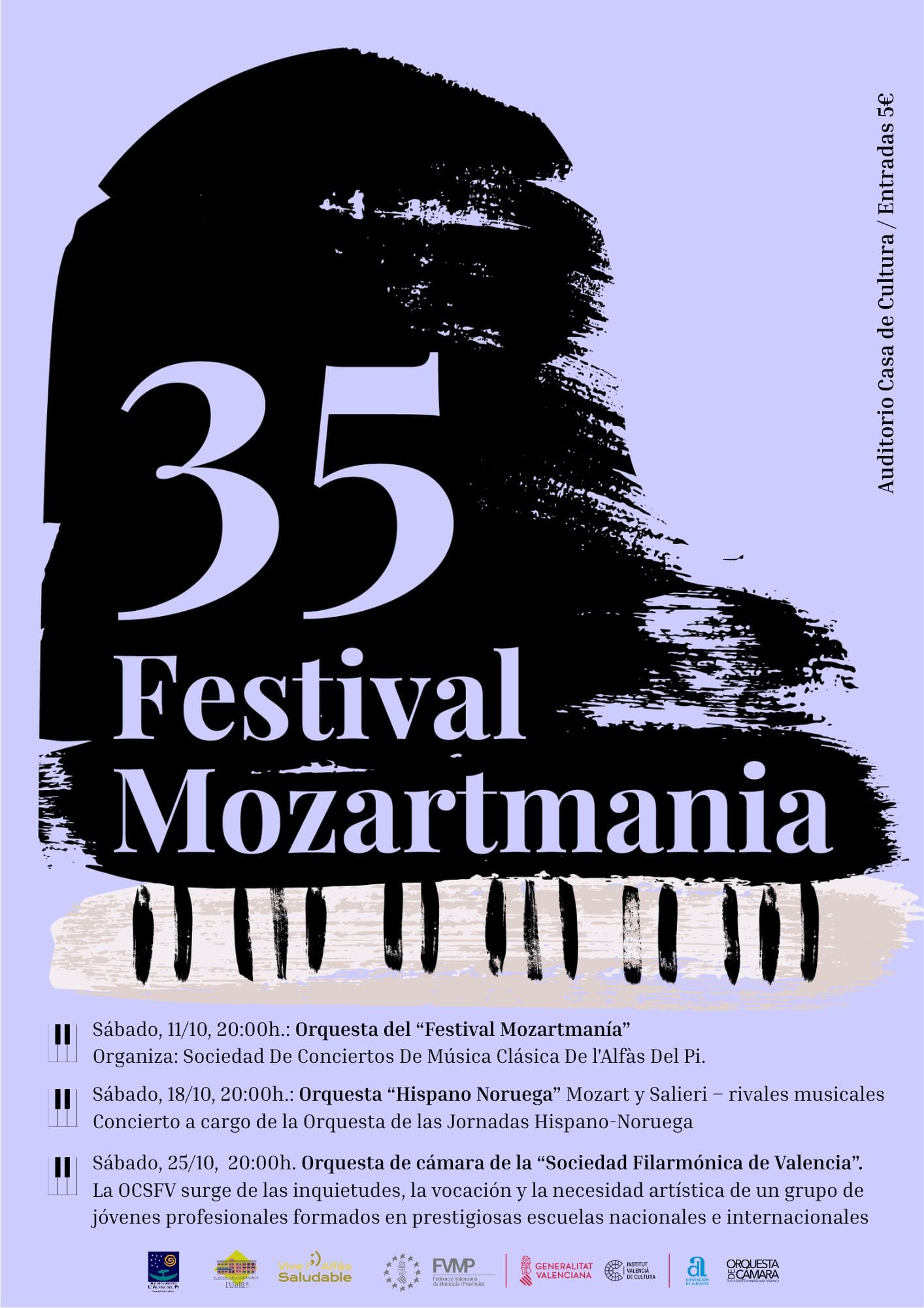 Finalmente el concierto de clausura será el sábado 25 de octubre, a las 20:00 horas, en la Casa de Cultura, a cargo de la Orquesta de Cámara de la Sociedad Filarmónica de Valencia. Integrada por jóvenes formados en prestigiosas escuelas internacionales como Amberes, Rotterdam, San Petersburgo, Budapest, Ginegra, Detmond y la ESMUC de Barcelona. Interpretarán cuatro obras de gran calidad. teniendo como eje central el Concierto para piano y orquesta K414 de Mozart, presentado en su versión para cuerdas. Lo acompañan composiciones de autores del siglo XX con lenguajes diversos: Sibelius, Chávarri y Holst. Piano solista Antonio galera, director Julen Fernández Pla.