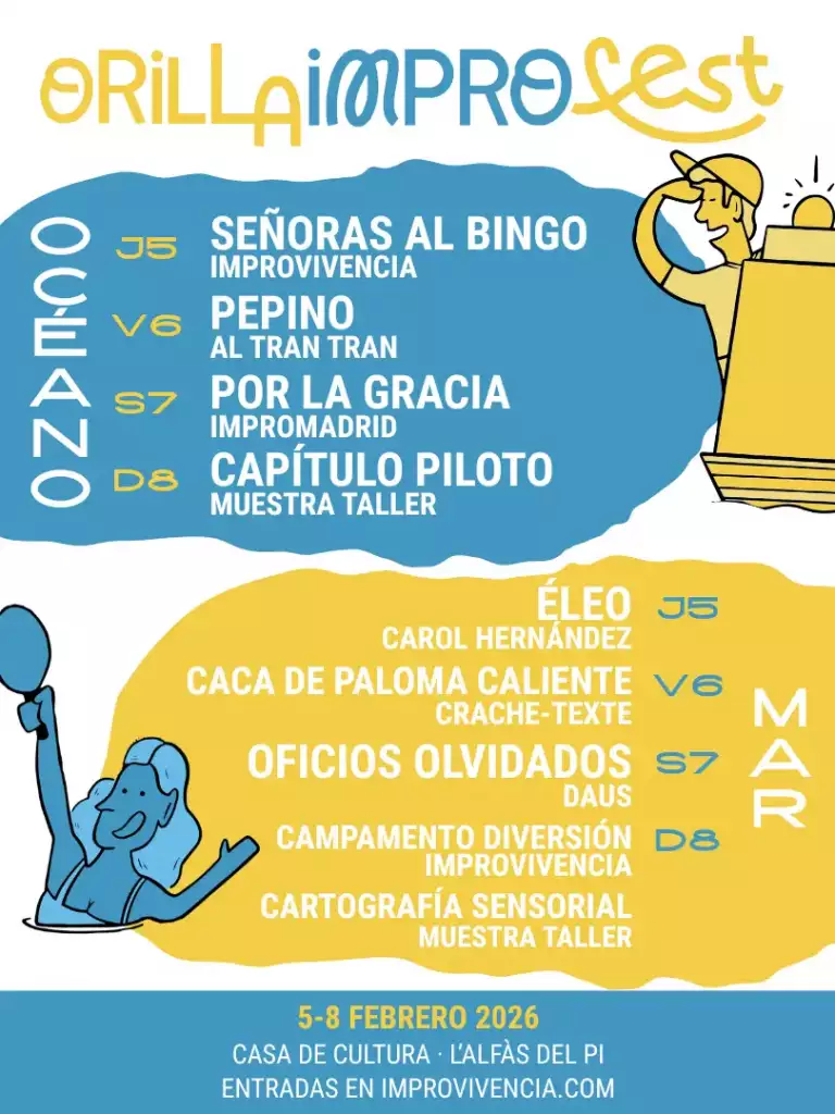 L’Alfàs del Pi acoge hasta el domingo 8 de febrero la segunda edición del Orilla Impro Fest, un certamen organizado por la compañía ImproVivencia, en colaboración con la concejalía de Cultura del Ayuntamiento de l’Alfàs del Pi. El festival contará en esta edición con un total de nueve espectáculos de teatro improvisado y una completa oferta formativa compuesta por nueve talleres, consolidándose como una cita destacada dentro del panorama nacional de la improvisación teatral.