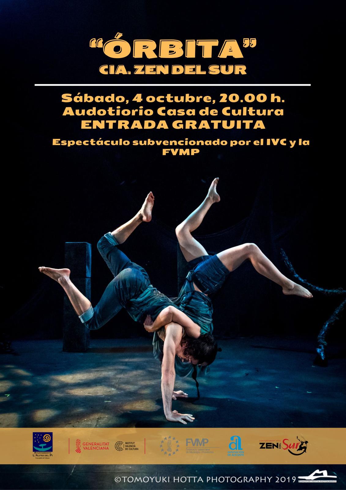El auditorio de la Casa de Cultura de l’Alfàs del Pi acoge este sábado 4 de octubre, a las 20:00 horas, ‘Órbita’, un impactante espectáculo de danza contemporánea de la compañía Zen del Sur. Una actividad que llega al municipio a través del Institut Valencià de Cultura y la Federación Valenciana de Municipios y Provincias. La entrada será libre y gratuita hasta completar aforo.