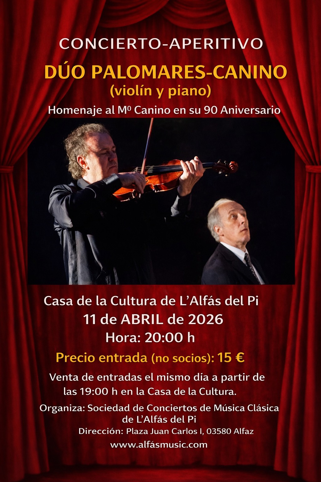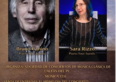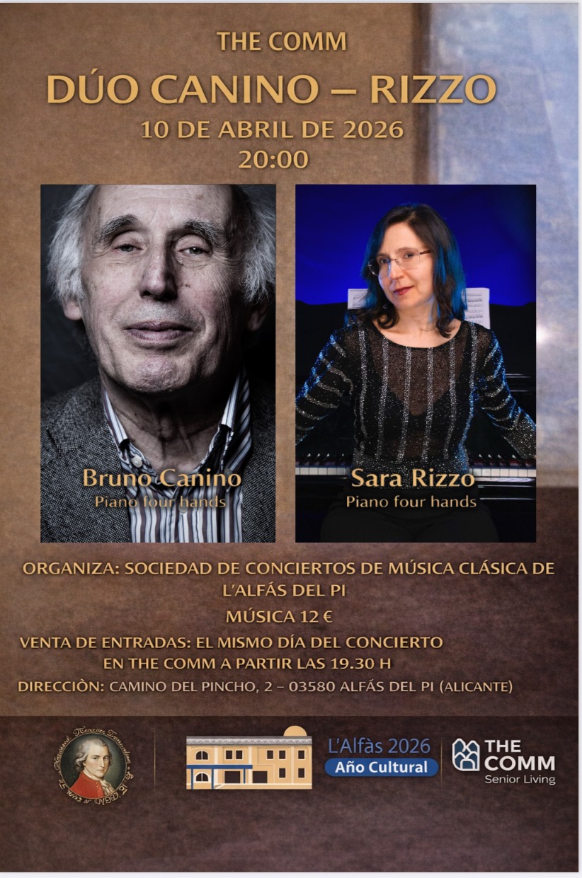 El sábado 11 de abril, a las 20:00 horas, el auditorio de la Casa de Cultura de l’Alfàs del Pi acogerá el concierto del Dúo Palomares-Canino, un homenaje al maestro Bruno Canino con motivo de su 90 aniversario. Las entradas tienen un precio de 15 euros, mientras que los miembros de la Sociedad de Conciertos de Música Clásica de l’Alfàs pueden acceder de forma gratuita, al tratarse de un evento integrado en el abono anual.