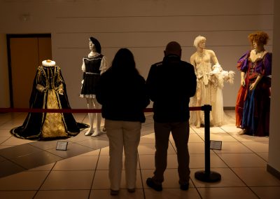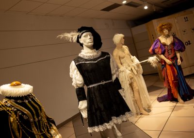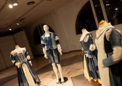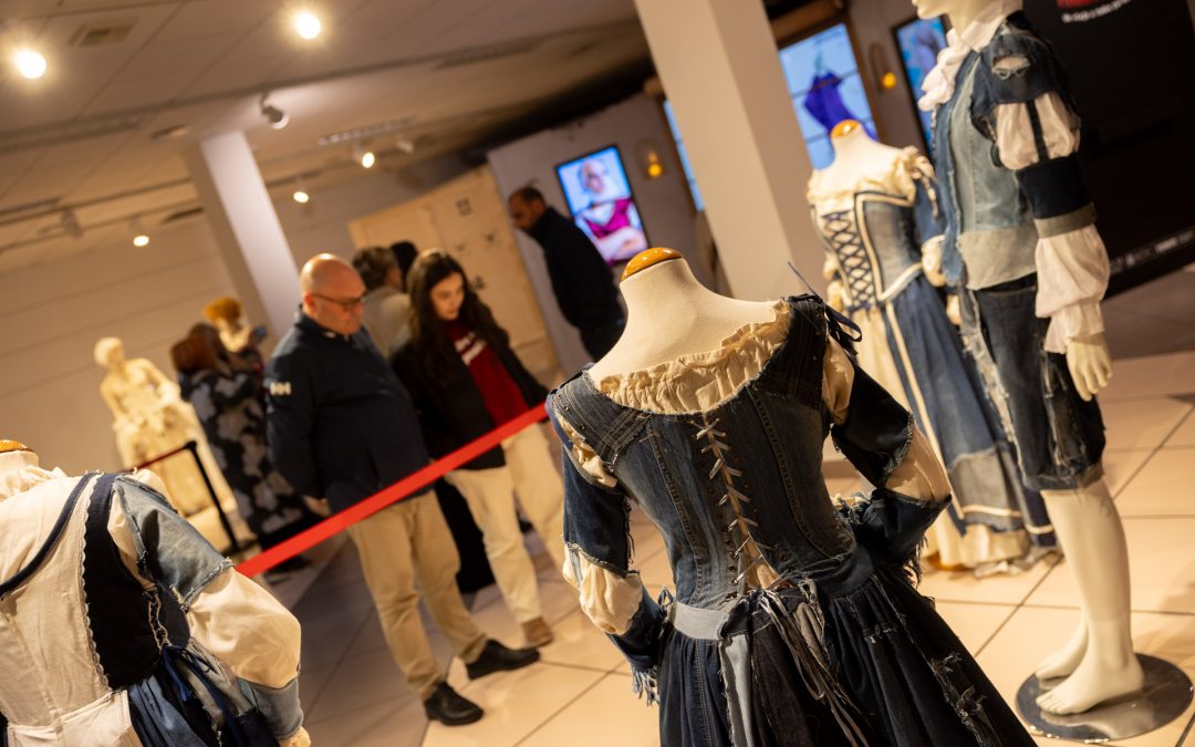 Entre las piezas expuestas se incluyen diseños creados para diferentes obras teatrales, entre ellas “La Celestina”, con un enfoque muy personal. Algunas de estas propuestas están realizadas con textil denim, aportando una reinterpretación contemporánea a personajes y estéticas del teatro clásico.