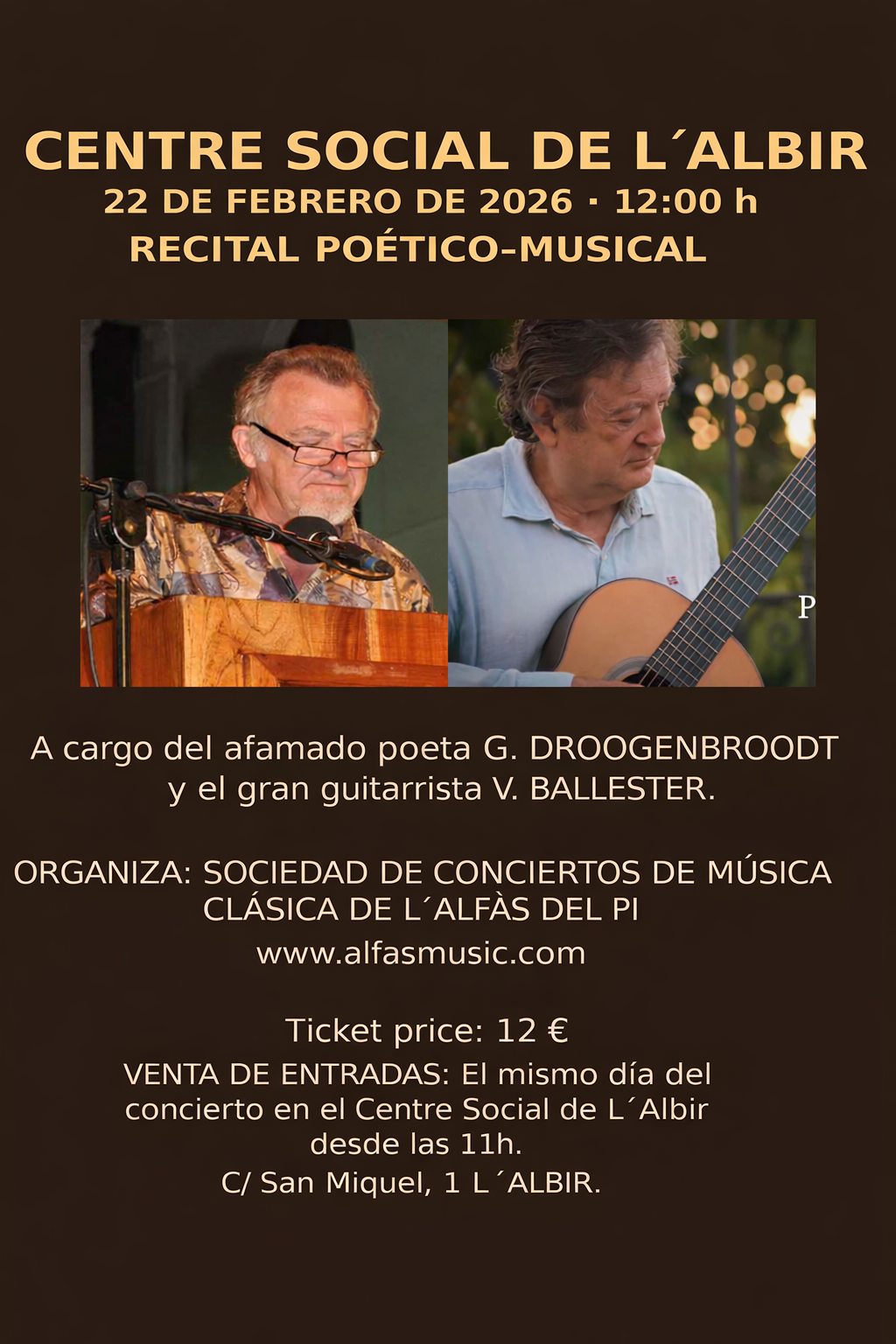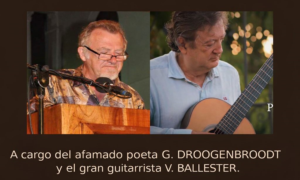 El próximo domingo 22 de febrero, a las 12:00 horas, el Centro Social Platja Albir acogerá un recital poético-musical a cargo del poeta belga Germain Droogenbroodt y del guitarrista español Vicente Ballester. La actividad, organizada por la Sociedad de Conciertos de Música Clásica de l’Alfàs del Pi en colaboración con la concejalía de Cultura, propone una experiencia única que fusiona la palabra poética con la música de guitarra en vivo.