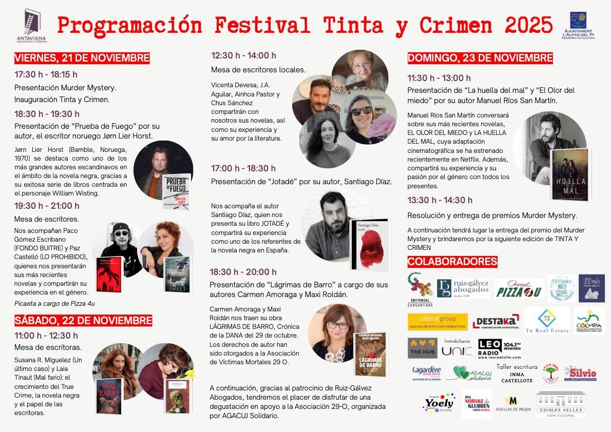 L’Alfàs del Pi se convierte esta semana en un punto de encuentro para los amantes de la novela negra con la celebración del primer Festival Tinta y Crimen, que se desarrollará del 21 al 23 de noviembre en el Espai Cultural Escoles Velles. Organizado por la Asociación Literaria Antaviana, en colaboración con la concejalía de Cultura, el evento reunirá a destacados autores nacionales e internacionales, ofreciendo charlas, mesas redondas, presentaciones de libros y encuentros literarios.