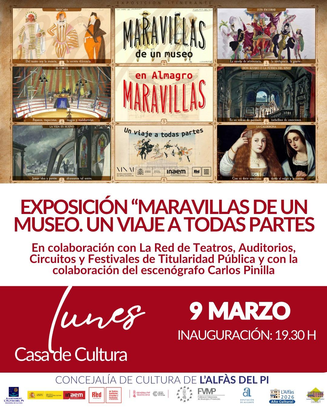 La Casa de Cultura de l’Alfàs del Pi inaugurará el próximo lunes 9 de marzo, a las 19:30 horas, la exposición itinerante “Maravillas de un museo. Un viaje a todas partes”, una muestra organizada por el Museo Nacional de Artes Escénicas (MNAE) y la Red Española de Teatros, Auditorios, Circuitos y Festivales de Titularidad Pública.