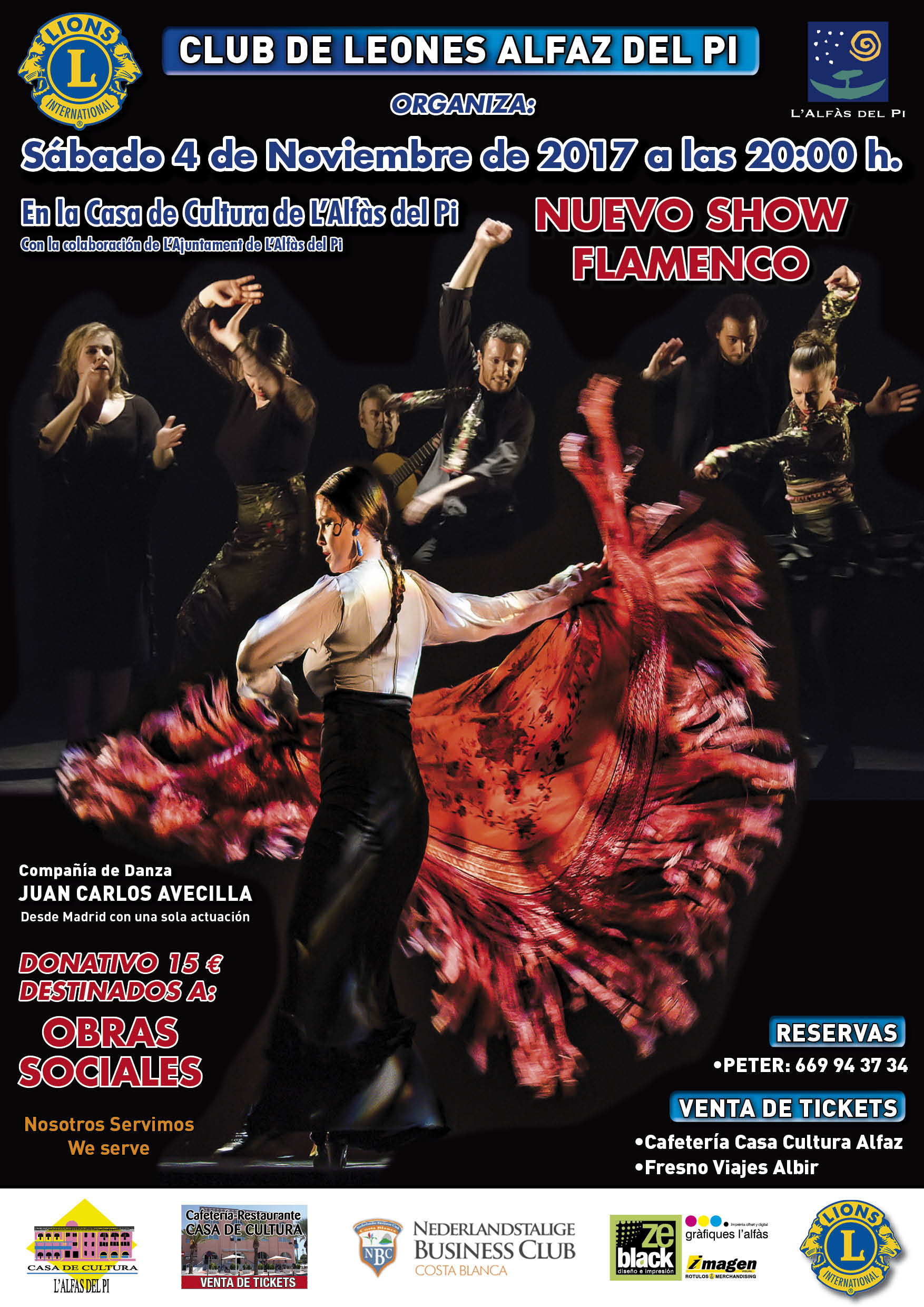 Un extraordinario Show flamenco en todas sus facetas, a cargo de la Compañía de Danza de Juan Carlos Avecilla, que se presenta en la Casa de Cultura de l’Alfàs del Pi el 4 de noviembre a las 20.00 horas. Las entradas, 15 euros, ya se pueden adquirir por adelantado. Los interesados pueden acudir directamente a la cafetería de la Casa de Cultura, o también a través del teléfono 669.943.734 (Peter de Lint).