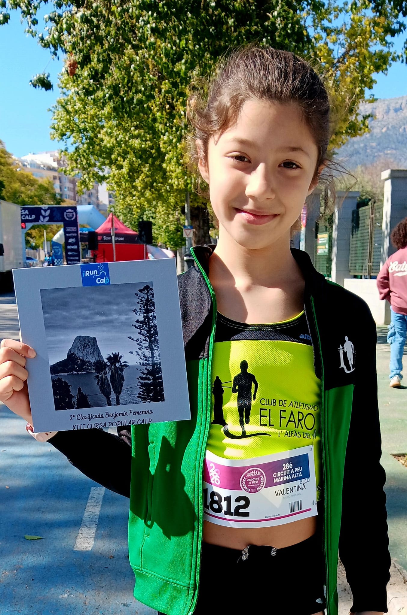 La actuación de los atletas de la escuela no acabó ahí. El domingo viajaron a Calpe donde participaron en la primera carrera del circuito Marina Alta. Valentina Baldó (benjamín) obtuvo la segunda posición corriendo 800m en 3’13”. Destacar la presencia de nuestros atletas en dicha carrera siendo la primera de muchas para unos y la vuelta a la competición para otros.