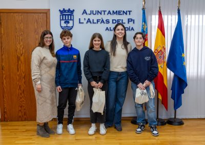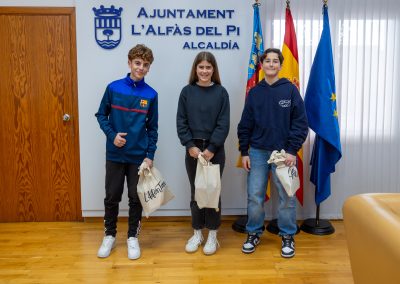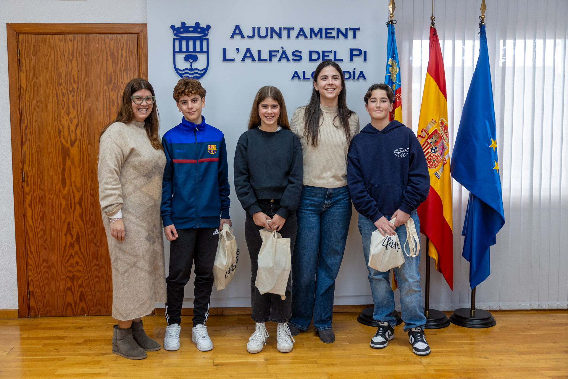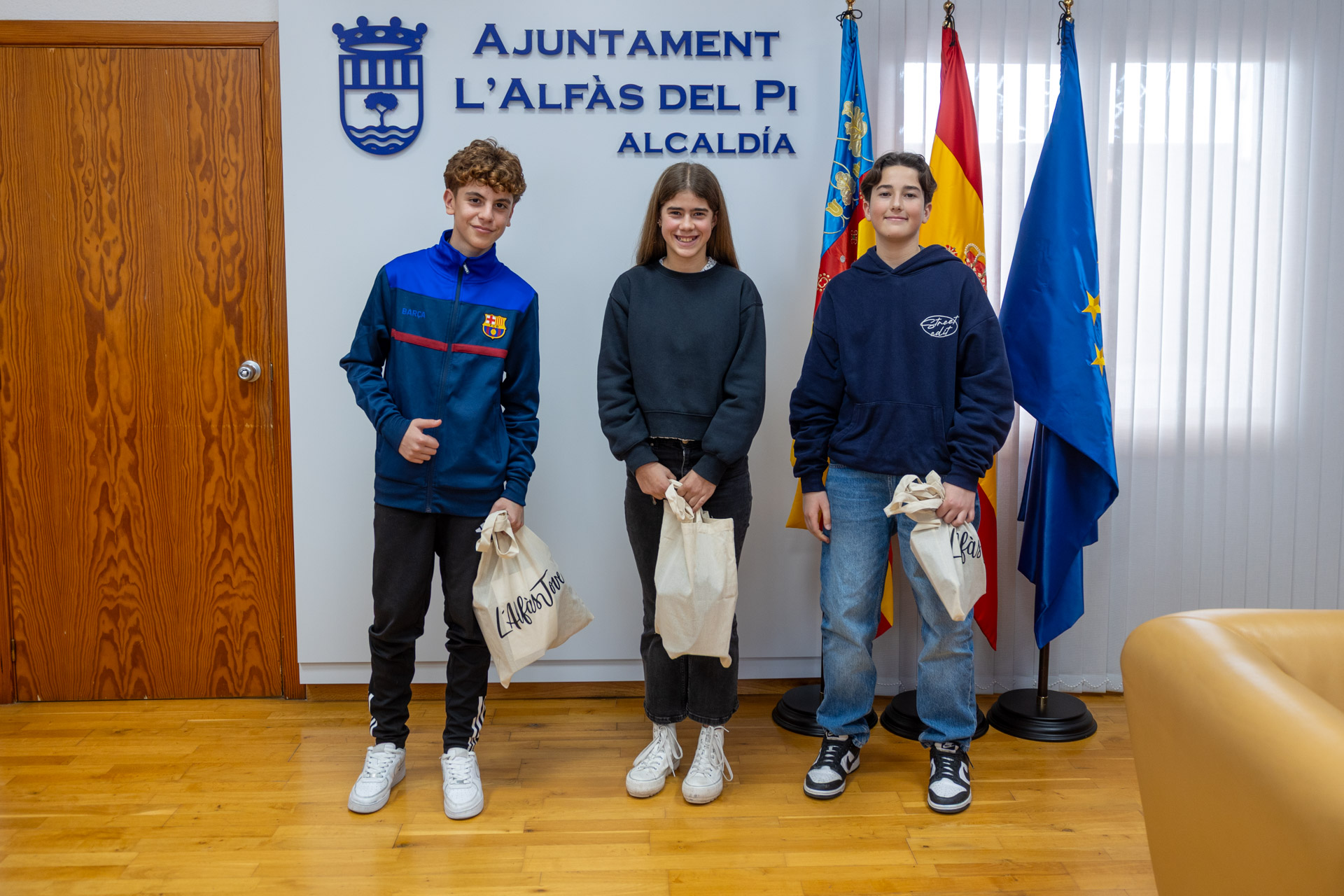 El alcalde de l’Alfàs del Pi, Vicente Arques, junto a la concejala de Educación, Laura Sevilla, recibió en el consistorio alfasino a los tres estudiantes en un sencillo acto de reconocimiento, en el que estuvieron acompañados por sus familiares, y por la directora del CEIP Racó de l’Albir, Ana Moratal.