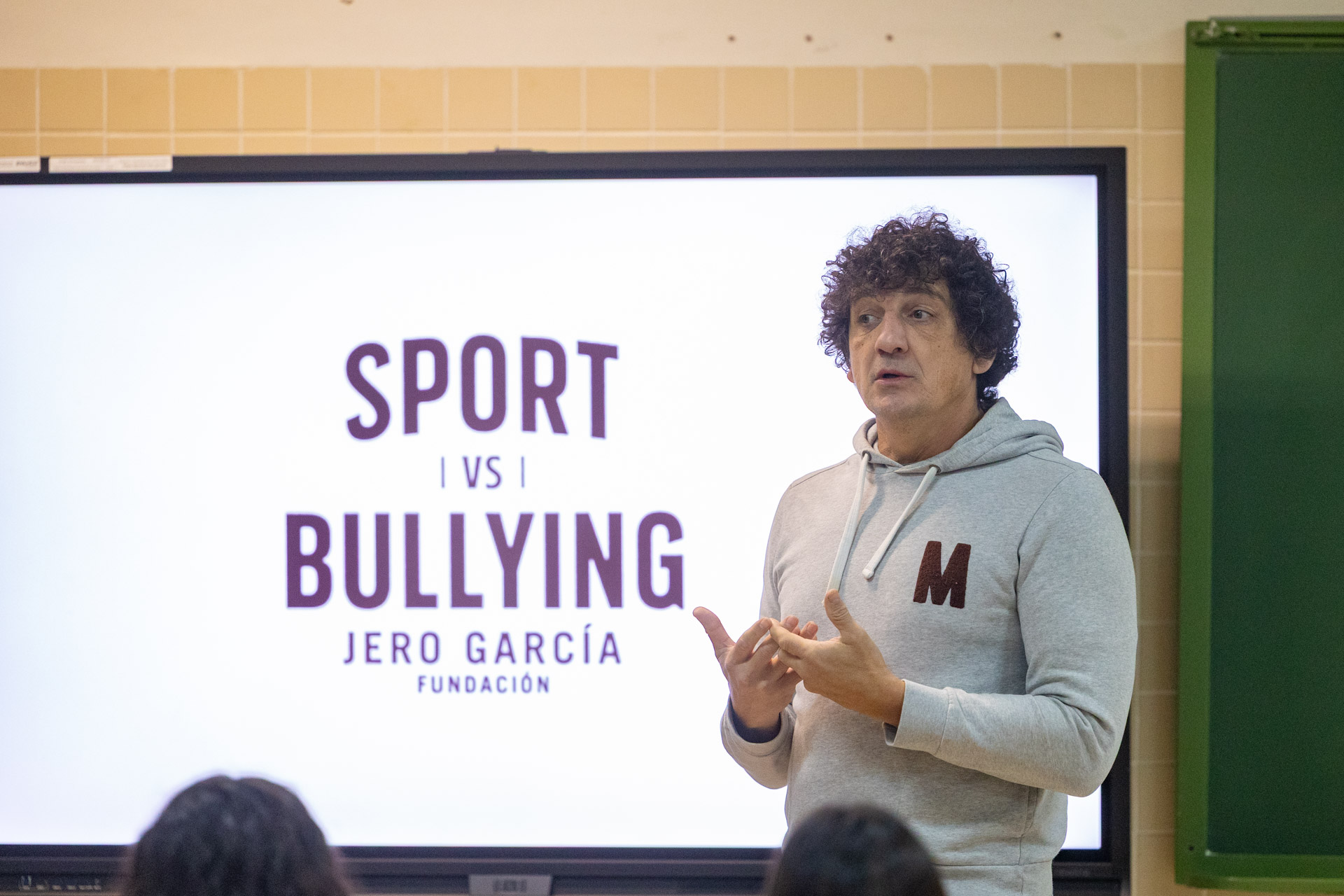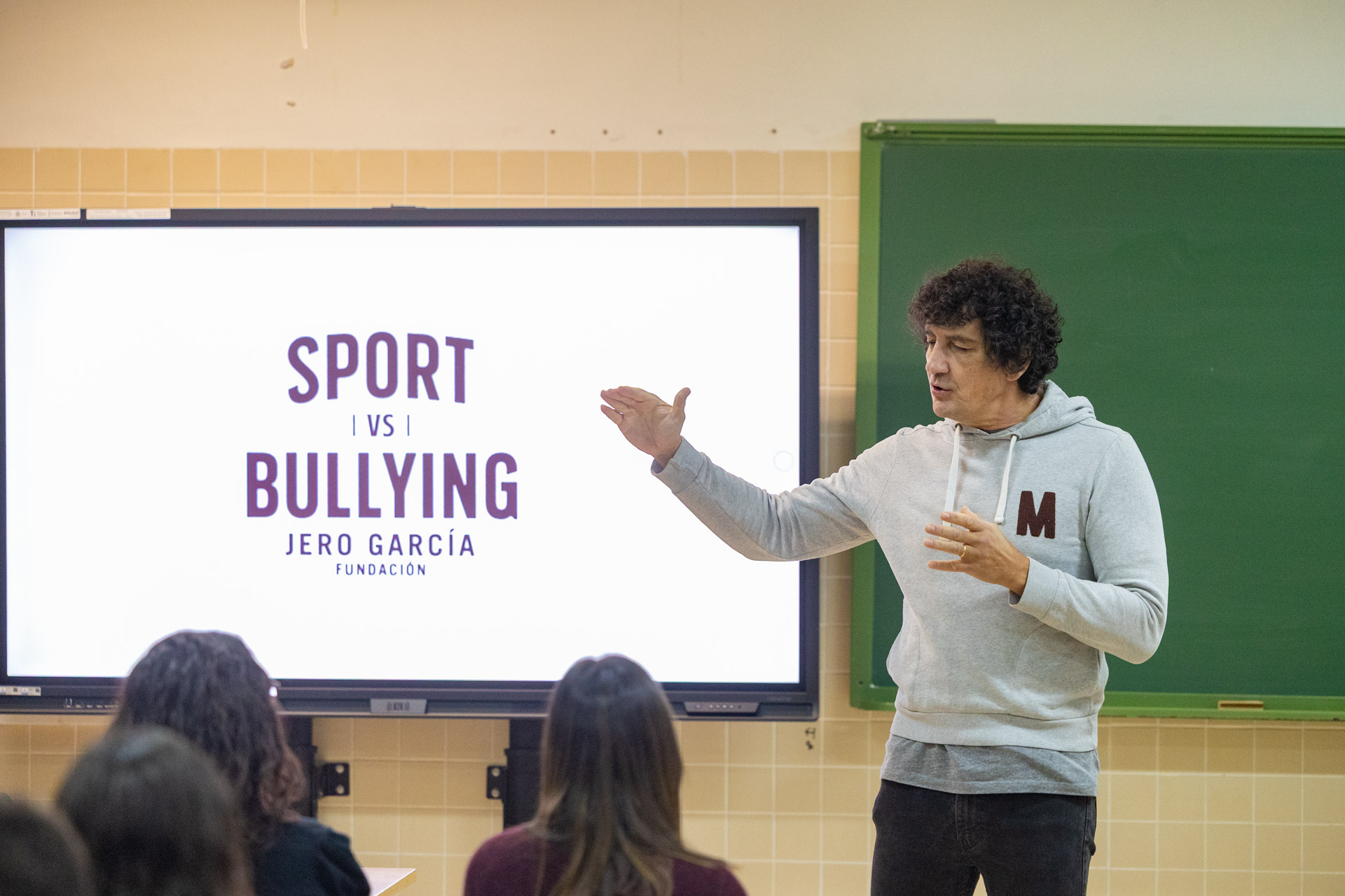 Jerónimo García, más conocido como Jero García, deportista, exboxeador profesional, campeón de España de boxeo, kick boxing y full contact. entrenador con más de veinticinco años de experiencia, quien fuera coach del formato televisivo Hermano Mayor, ha impartido una charla en el IES l’Arabí de l’Alfàs del Pi, sobre los efectos positivos del deporte para promover la inclusión social y afrontar el bullying.