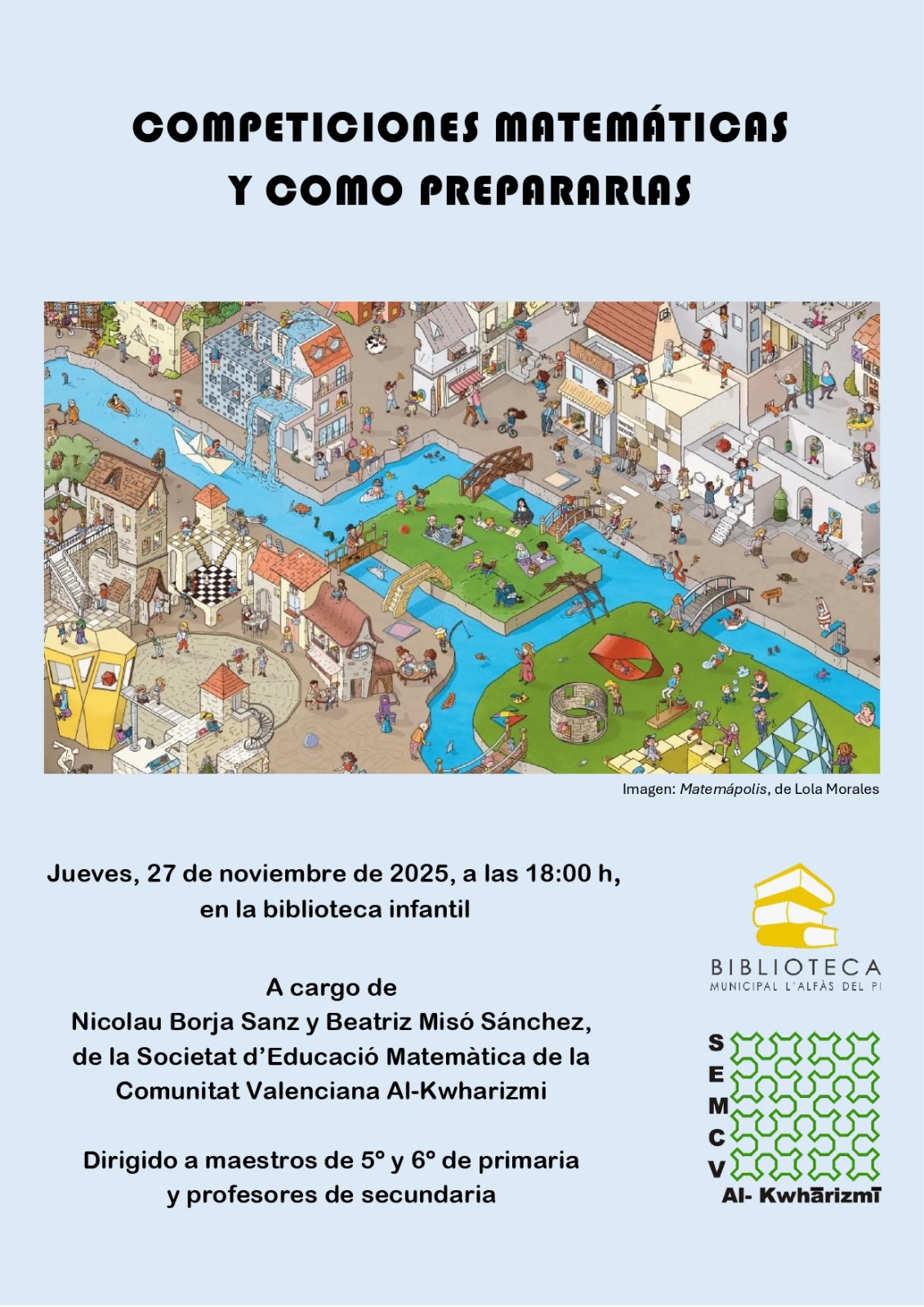 El próximo jueves 27 de noviembre, a las 18:00 horas, la Biblioteca Infantil de l’Alfàs del Pi acogerá la charla titulada “Competencias de matemáticas y cómo prepararlas”, una sesión formativa dirigida a maestros de 5º y 6º de Primaria y a profesores de Secundaria.