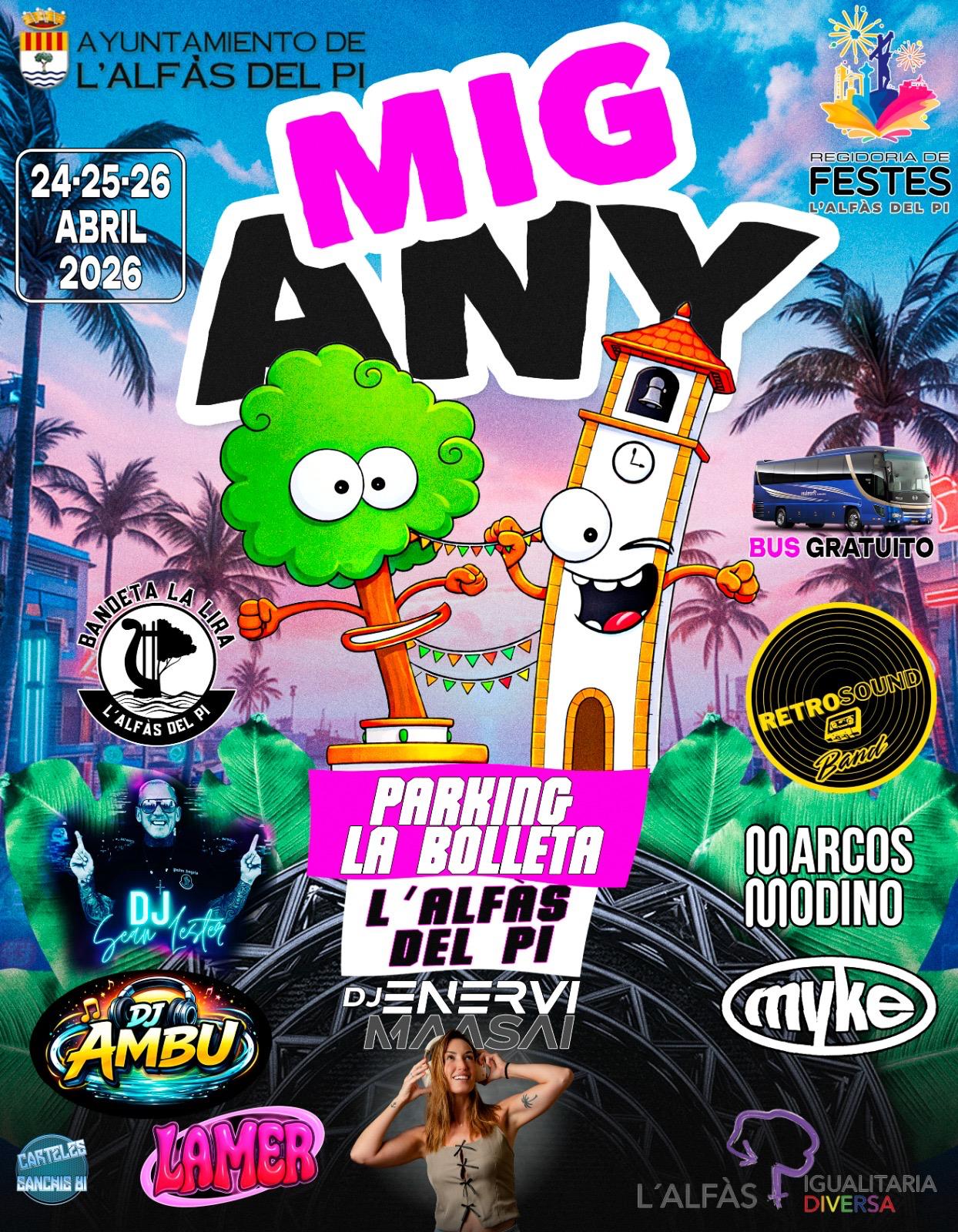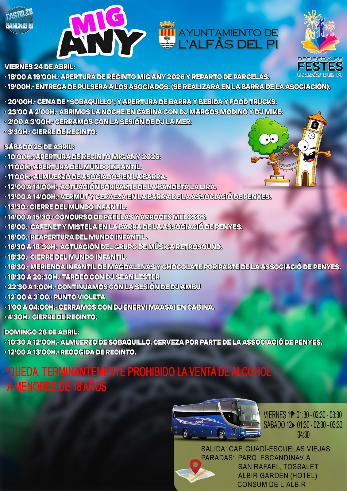 Con el fin de facilitar una participación responsable, la concejalía de Fiestas y Tradiciones pondrá en marcha un servicio especial de autobús gratuito con salida desde el parking de La Bolleta y paradas en diferentes puntos del municipio, como Escandinavia, San Rafael, Tossalet, Albir Garden y Consum Albir. El viernes operará en horario nocturno con salidas a la 1:30, 2:30 y 3:30 horas, mientras que el sábado se ampliará hasta las 4:30 horas.