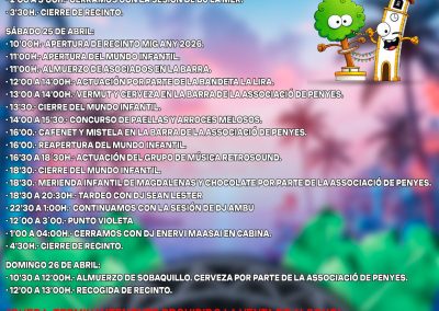 Mañana sábado, las actividades arrancarán a las 10:00 horas. A las 11:00 tendrá lugar un almuerzo peñero en la barra de la Associació, seguido de un aperitivo con cerveza y vermut a partir de las 13:00 horas. Uno de los actos centrales será el concurso de paellas, que por tercer año alberga también la categoría de arroces melosos. Por la tarde se ofrecerá café y mistela, mientras que la animación musical correrá a cargo del grupo Retrosound y de los DJ Sean Lester, DJ Ambu y DJ Enervi Maasai.