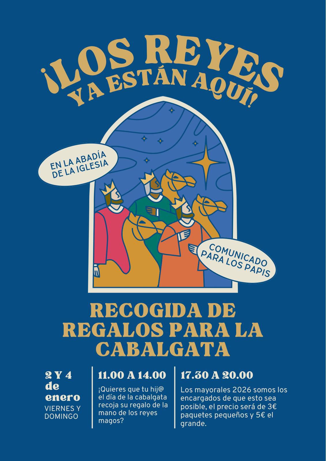Además, los Mayorales del Cristo 2026 van a estar en la Abadía de la Iglesia los días 2 y 4 de enero, próximos viernes y domingo, en horario de 11:00 a 14:00 horas y de 17:30 horas a 20:00 horas, para ayudar a sus mágicas majestades en la recogida de regalos.