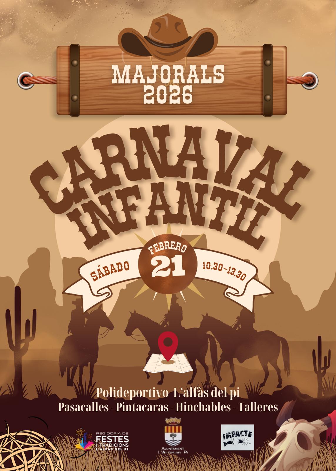 El Carnaval Infantil se celebrará de 10:30 a 13:30 horas e incluirá pasacalles, mundo infantil, pintacaras, hinchables y talleres, ofreciendo a los más pequeños una mañana llena de diversión y actividades lúdicas.