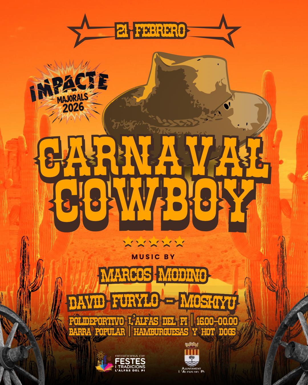 Por la tarde, a partir de las 16:00 horas, dará comienzo el Carnaval Cowboy, una fiesta dirigida al público adulto que contará con la ambientación musical de Marcos Modino, David Furylo y Moskiyu. La celebración se prolongará hasta la medianoche e incluirá barra popular con hamburguesas, hot dogs y otras propuestas gastronómicas.