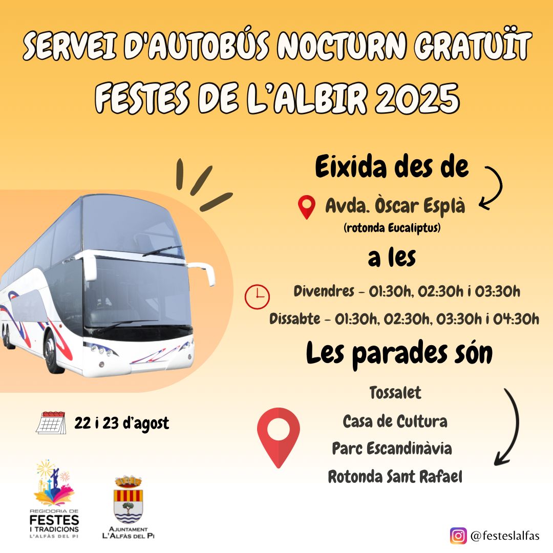 🔹 Servicio de autobús nocturno gratuito a las 01:30, 2:30 y 3:30 con paradas en Parque de los Eucaliptos, Tossalet, Casa de Cultura, Parque Escandinavia y Rotonda de San Rafael.