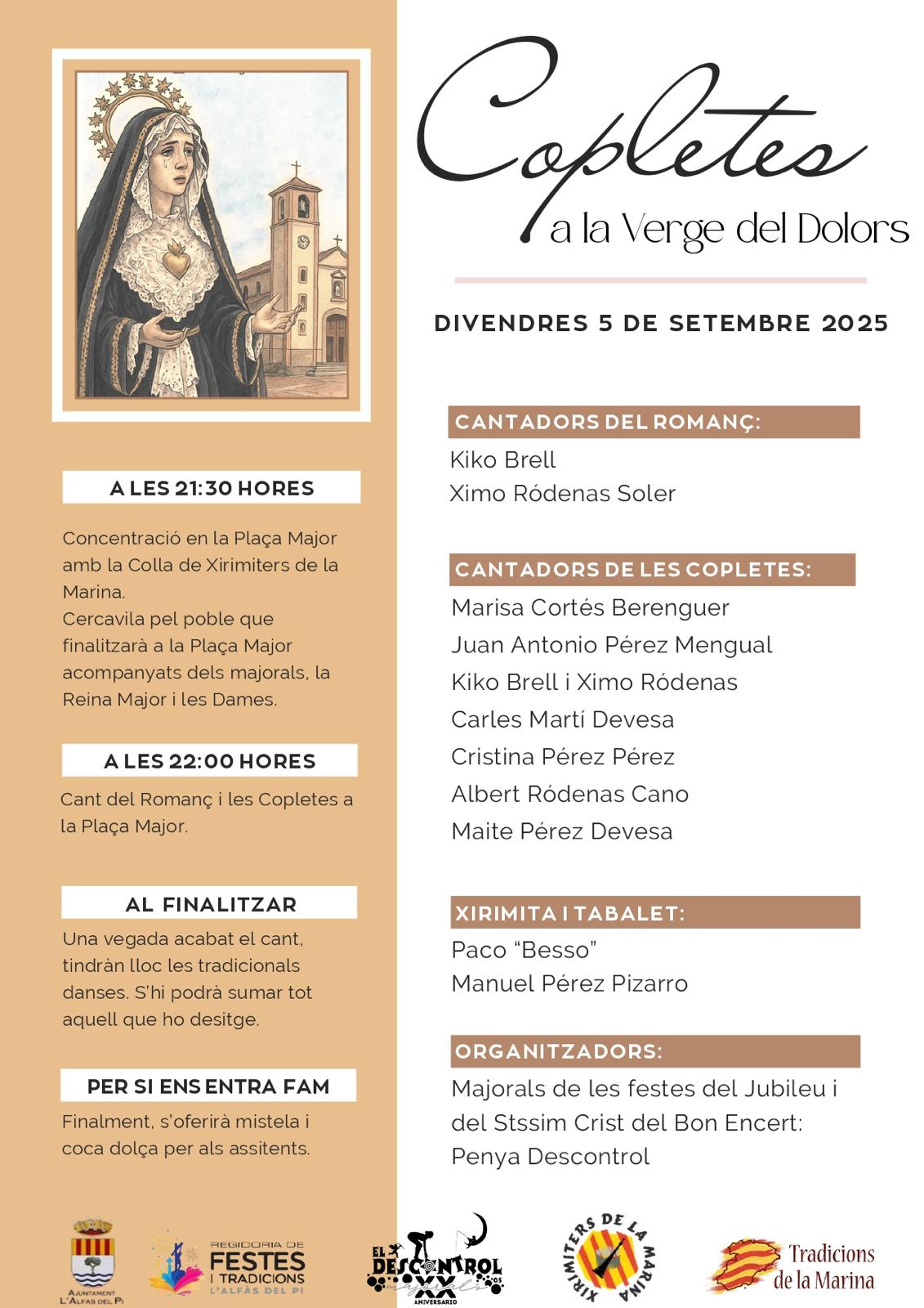 El próximo viernes 5 de septiembre a las 22:00 horas se cantarán un año más ‘Les Copletes a la Verge del Dolors’, una de las fiestas más antiguas de la comarca, organizadas por los Mayorales de las Fiestas del Santísimo Cristo del Buen Acierto, la peña el descontrol, en colaboración con la Colla de Xirimiters de la Marina y la concejalía de Fiestas y Tradiciones del Ayuntamiento de l’Alfàs del Pi.