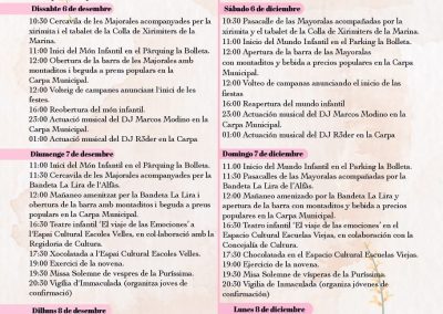 El sábado 6 de diciembre comenzará con un pasacalle de las Mayoralas de la Purísima, acompañadas por la Colla de Xirimiters de La Marina. A las 11:00 horas dará inicio el mundo infantil, que se retomará por la tarde a partir de las 16:00 horas, con servicio de barra durante la mañana. La fiesta continuará por la noche en la carpa con las actuaciones de DJ Marcos Modino y DJ R3der.