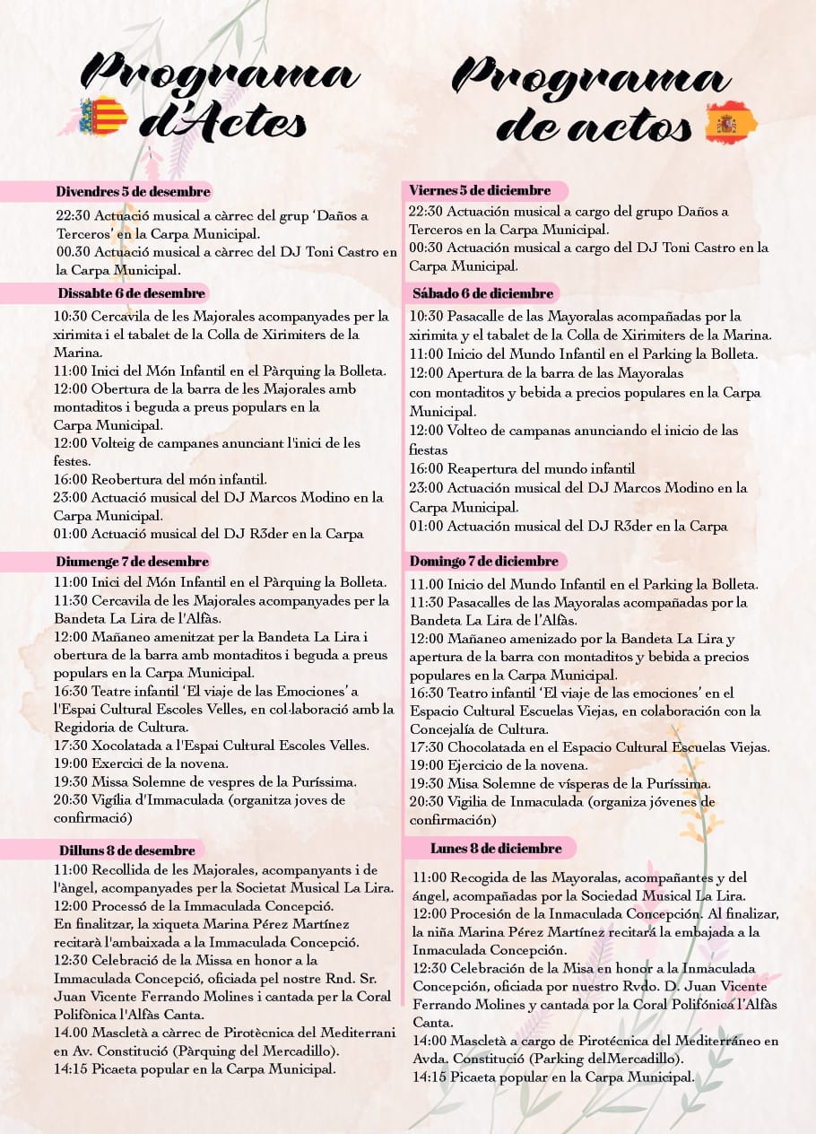 El lunes 8 de diciembre, Día de la Inmaculada Concepción, los actos comenzarán a las 11:00 horas con la recogida de las Mayoralas y del ángel, acompañadas por la Sociedad Musical La Lira. A las 12:00 horas se iniciará la procesión en honor a la Inmaculada Concepción. Al finalizar, la niña Marina Pérez Martínez recitará la embajada, tras la cual se oficiará la misa, celebrada por el párroco Juan Vicente Ferrando Molines y cantada por la Coral Polifónica L’Alfàs Canta. La jornada concluirá con una mascletà en la avenida Constitución, a cargo de Pirotecnia del Mediterráneo, y una picaeta popular en la carpa municipal.