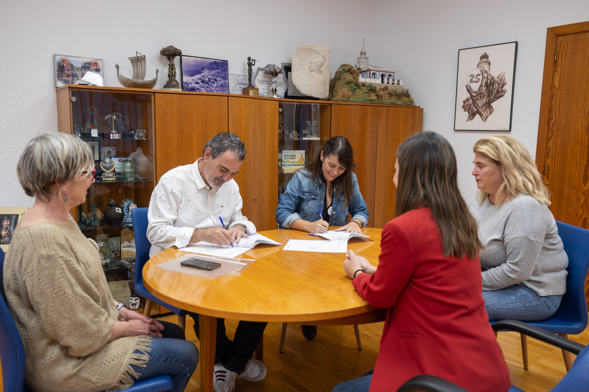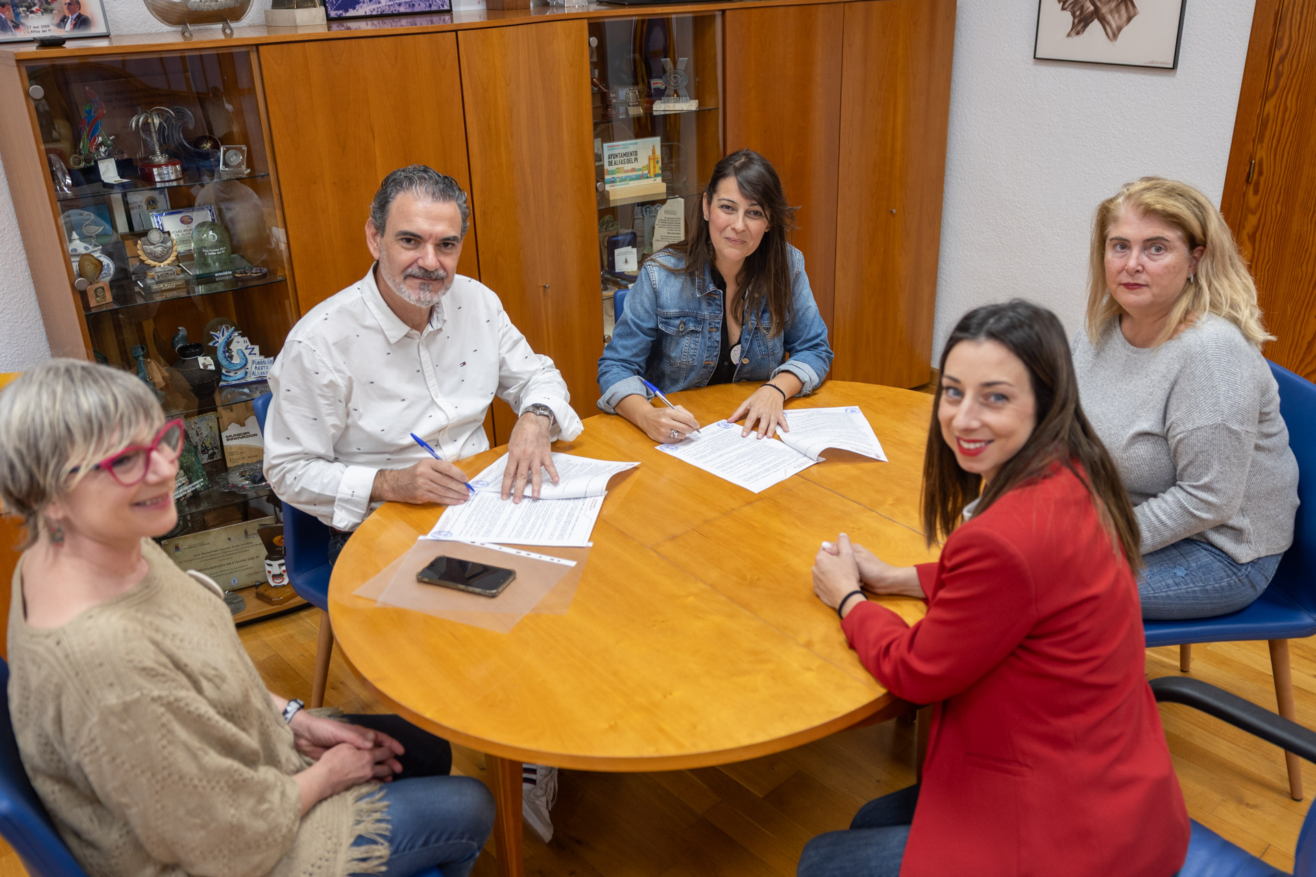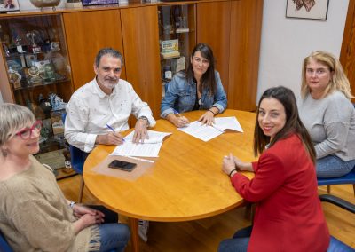 A la firma del convenio han asistido el alcalde de l’Alfàs del Pi, Vicente Arques; la concejala de Igualdad, Laura Sevilla, y la presidenta de Huellas de Mujer, Raquel Guerrero, acompañada de parte de su junta directiva.