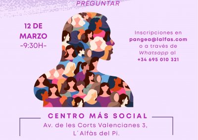 Para el jueves 12 de marzo se ha programado un taller sobre sexo y salud en el Centro L’Alfàs + Social, impartido por la sexóloga Isabel Peñarrocha, de la Unidad Sexual y Reproductiva del Hospital Marina Baixa. Esta actividad está organizada por la Oficina Pangea en colaboración con las área de Sanidad e Igualdad.