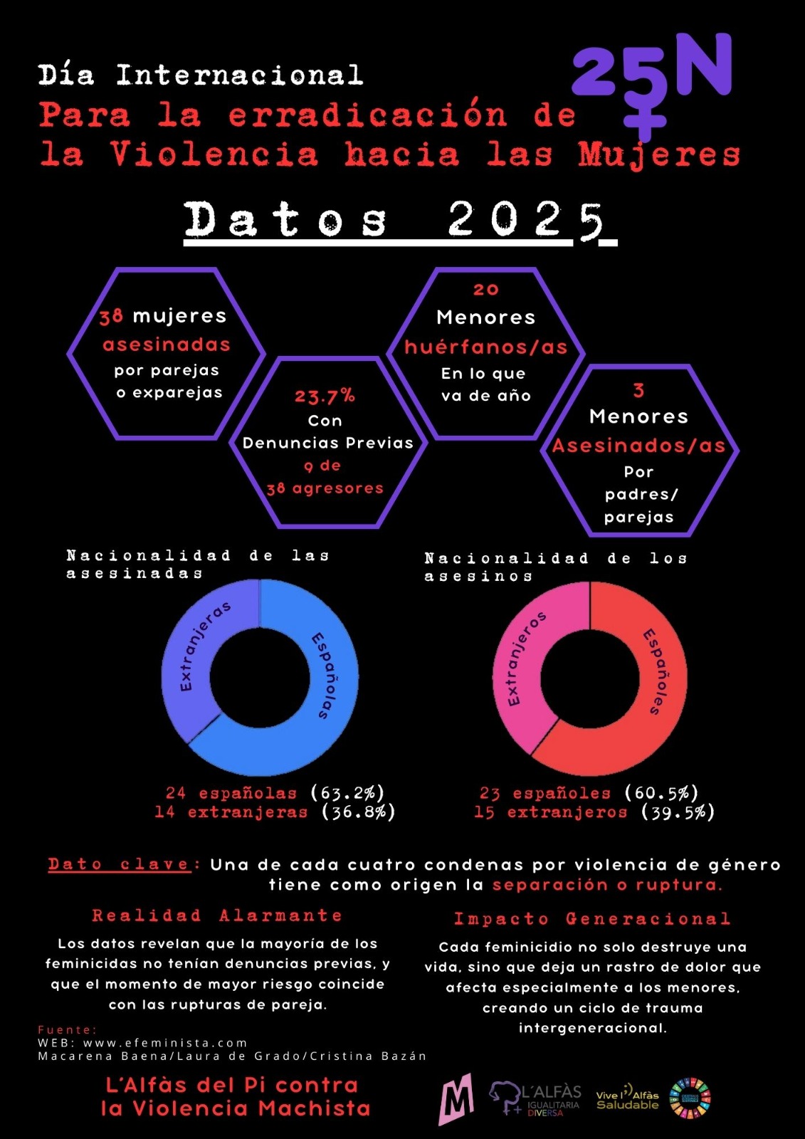 El Ayuntamiento de l’Alfàs del Pi invita a toda la ciudadanía a participar en las actividades programadas con motivo del 25N, una jornada que pretende promover la reflexión y el compromiso colectivo en la lucha contra la violencia hacia las mujeres.