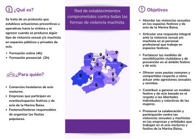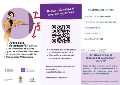 Para adherirse al protocolo y recibir la formación, los establecimientos, entidades y personas que lo deseen tienen que firmar un compromiso contra las violencias sexuales en los locales de ocio, que pone a su disposición la concejalía de Igualdad del Ayuntamiento de l’Alfàs.