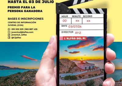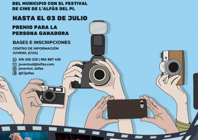 El 36 Festival de Cine de l’Alfàs del Pi convoca, en colaboración con la concejalía de Juventud, dos concursos dirigidos a fomentar la creatividad, el talento y la participación juvenil, aunando cine, fotografía y nuevas tecnologías. Se trata del concurso de cortos ‘Tu móvil de cine’, que se lanza por segundo año consecutivo, y el concurso de fotografía ‘Un municipio de cine’, una de las novedades de esta trigésimo sexta edición.