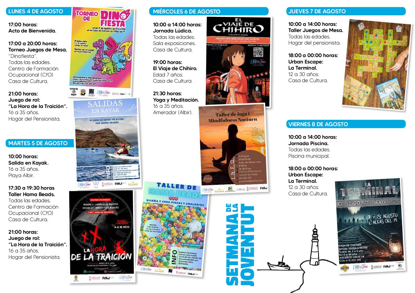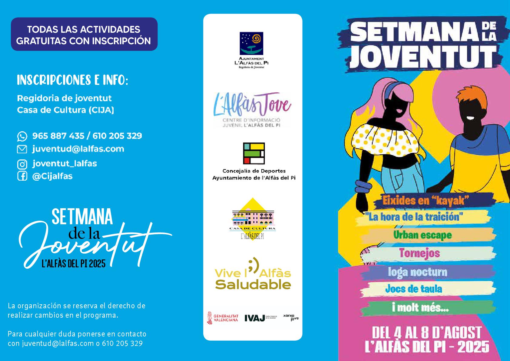 Todas las actividades incluidas en la cuarta Setmana de la Joventud son gratuitas, pero requieren inscripción previa por temas organizativos. Las personas interesadas en participar deberán inscribirse en el Centro de Información Juvenil de l’Alfàs. Pueden solicitar más información llamando a los números de teléfono 610.205.329 y 965.887.435 o a través de la dirección de correo electrónico juventud@lalfas.com.
