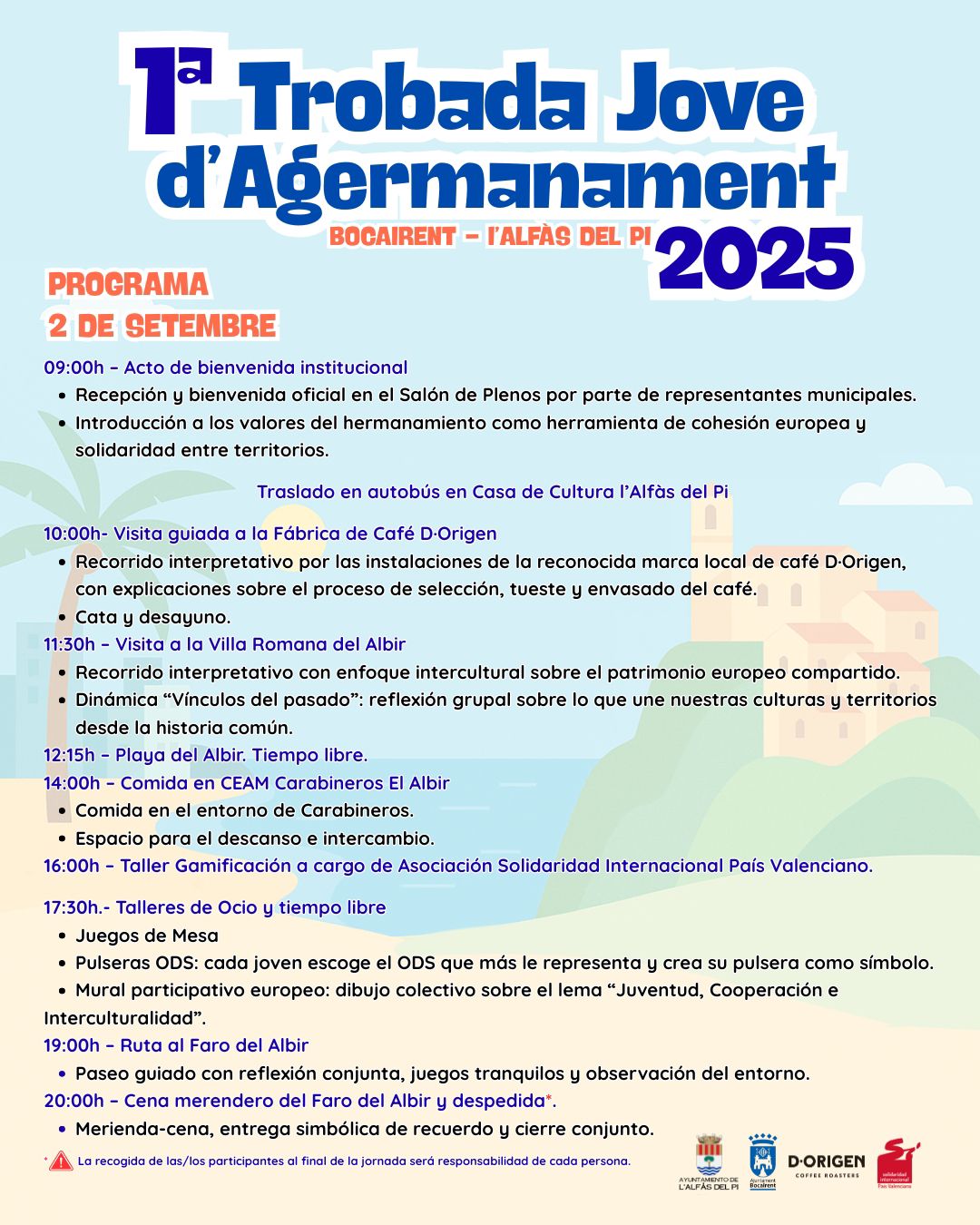 Las poblaciones de Bocairent y l’Alfàs del Pi, tras sellar una alianza para impulsar actividades juveniles y de cooperación, van a celebrar la 1ª Trobada Jove d’Agermanament durante dos días, el 2 de septiembre en l’Alfàs y el 4 de septiembre en Bocairent, con un amplio programa de actividades gratuitas, recomendadas eso sí para chicos y chicas mayores de 16 años