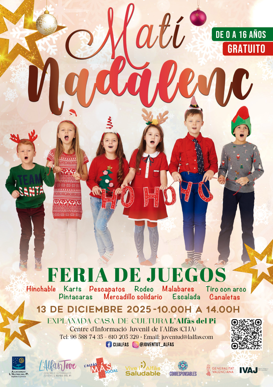 El próximo sábado 13 de diciembre, de 10:00 a 14:00 horas, la explanada de la Casa de Cultura de l’Alfàs del Pi se llenará de diversión y entretenimiento para toda la familia con la celebración de una nueva edición del ‘Matí Nadalenc’, una feria de juegos que, en su quinta edición, promete ser más divertida y variada que nunca. La iniciativa, organizada por la concejalía de Juventud del Ayuntamiento de l’Alfàs del Pi, ofrece una jornada llena de actividades gratuitas para el público infantil y juvenil, con el objetivo de fomentar el ocio activo y la creatividad en un ambiente familiar.
